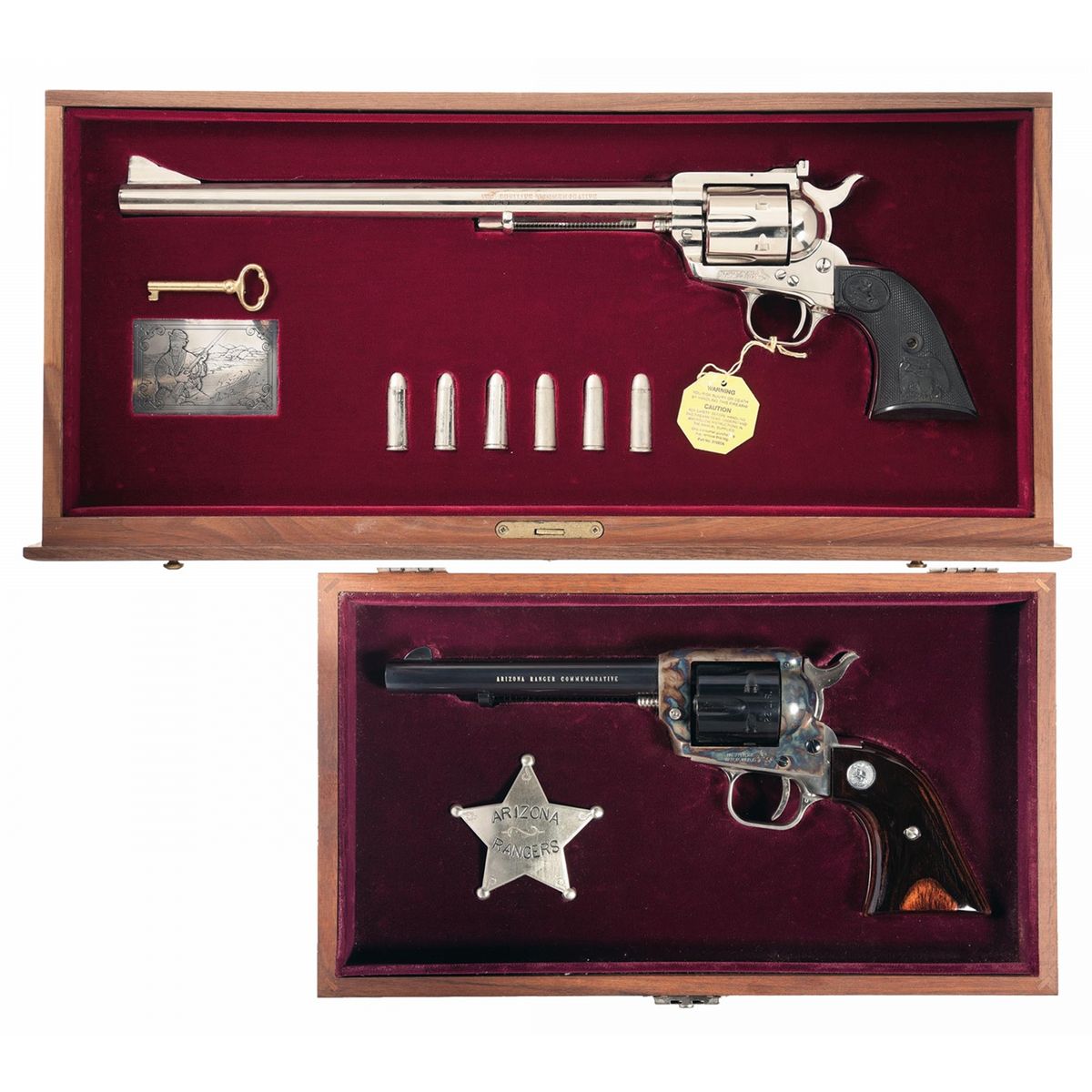 - B) Issued in 1972 with only 3,000 manufactured, making this a relatively early example. Standard Colt markings. With a glass lid wooden display case, key and Arizona Rangers badge.