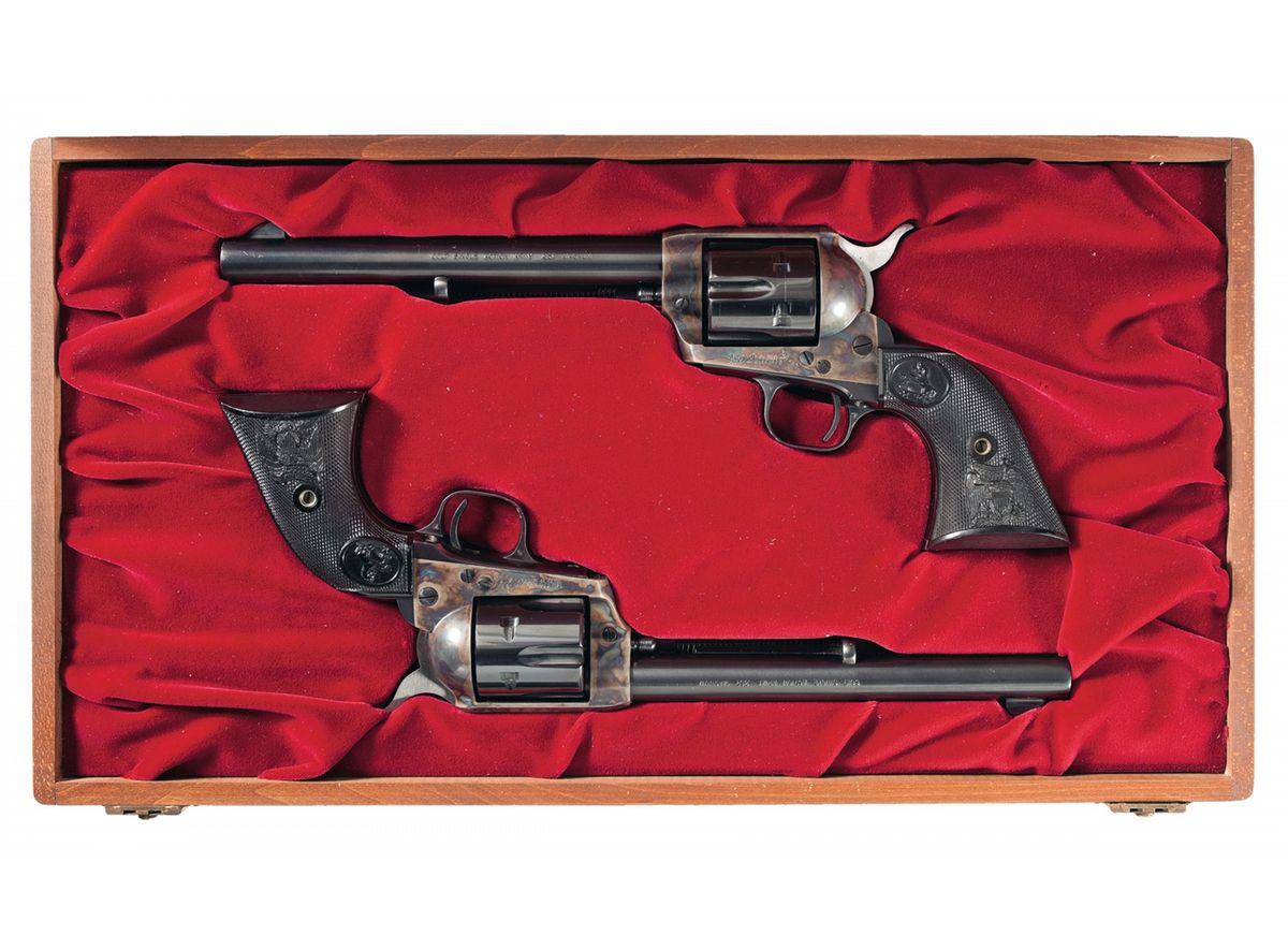 A) Manufactured in 1974. Triangle "VP" proofmark is stamped on the left front of the trigger guard, a "K" is stamped on the left rear of the trigger guard and "721" is stamped on the loading gate. Fitted with checkered hard rubber Rampant Colt/American Eagle grips. With a Colt hardwood case lined in red fabric.
