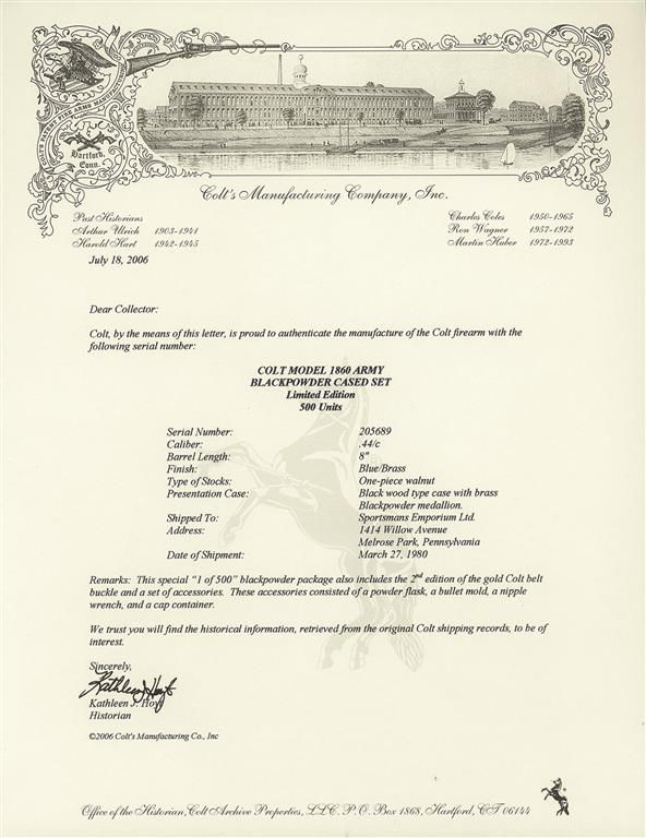 A) This 1 of 500 Black Powder Series cased set comes with a black hardwood case lined in gold velvet, an empty cap tin, a bullet mold, a powder flask, a screwdriver/nipple wrench, an accessory box and a factory letter than confirms the configuration, that it was shipped to Sportmans Emporium Ltd., that it came with the accessories listed and that it came with a 2nd edition belt buckle that is not included.