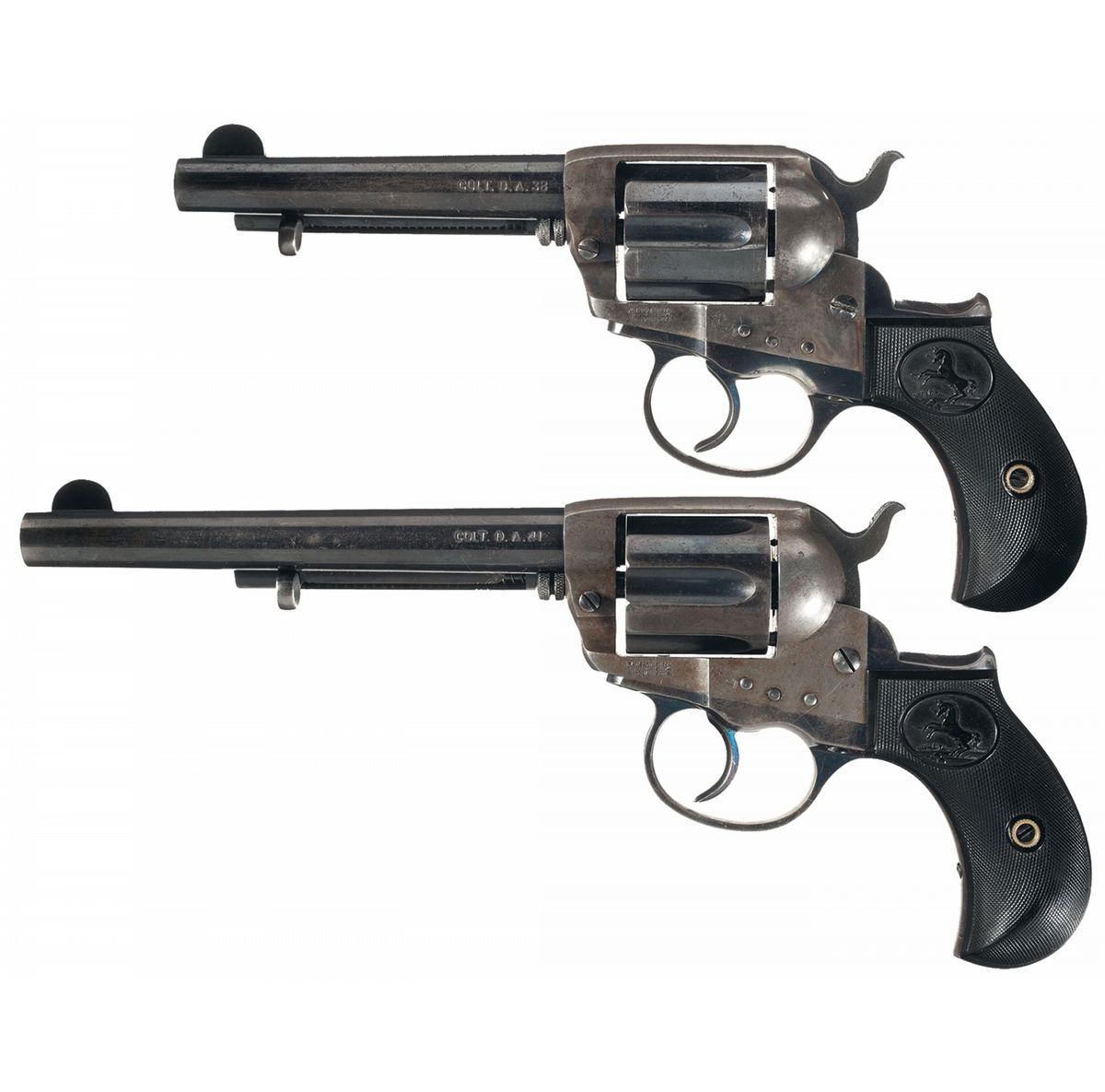 - B) Manufactured in 1900. Standard barrel markings with the frame having the three line, three patent date marking with Rampant Colt. Fitted with checkered Rampant Colt grips. Matching numbers on frame and grip straps with assembly number "287" on the loading gate.