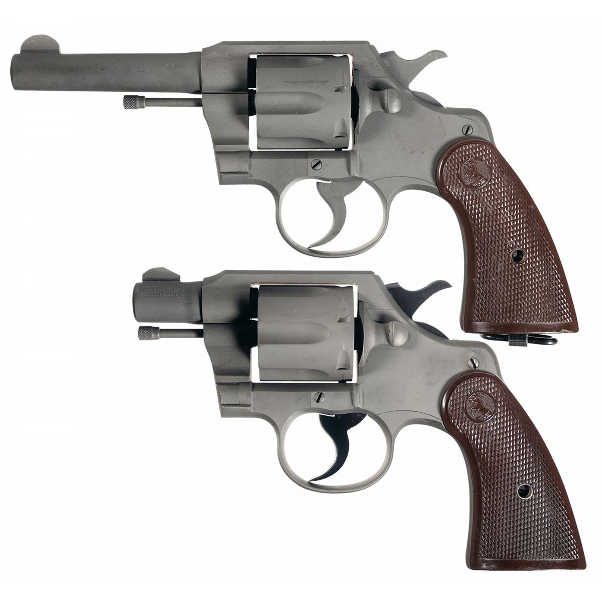- B) This model has the short 2 inch barrel, a small ordnance bomb on the top left of the frame, the butt is stamped "11.", a smooth trigger, checkered hammer, blade front sight, frame notch rear sight and fitted with checkered brown plastic grips with Colt imprint.