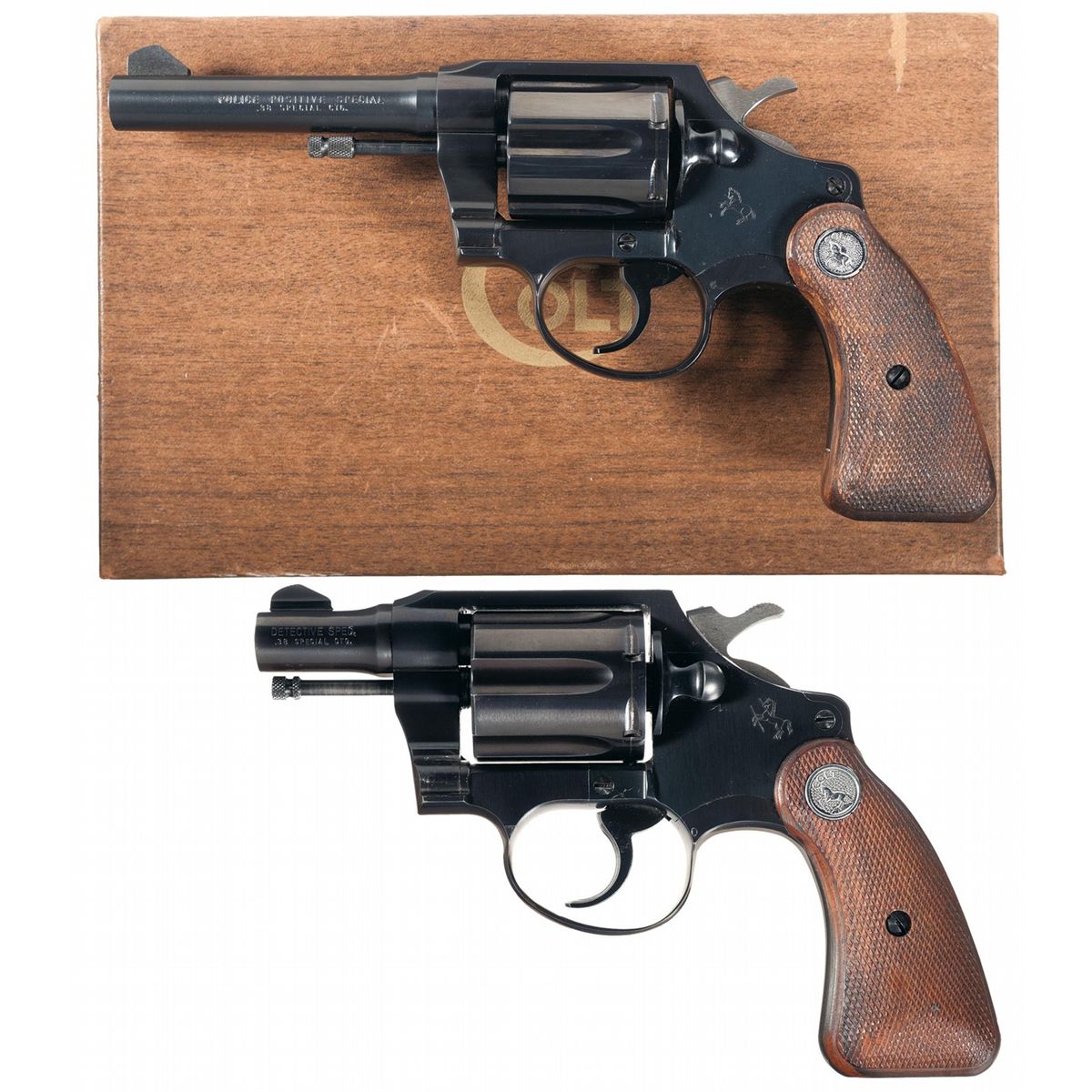 A) This revolver was manufactured in 1971 and is marked on the right side of the barrel with the single line Hartford address and on the left side "POLICE POSITIVE SPECIAL/.38 SPECIAL CTG.". This revolver has a smooth trigger, serrated hammer with polished sides, blade front sight, frame notch rear sight, and fitted with checkered walnut grips with silver Colt medallions. With a Colt box hand numbered to the gun, Colt "woodgrain" top and "HANDLING/THE/HANDGUN" pamphlet.