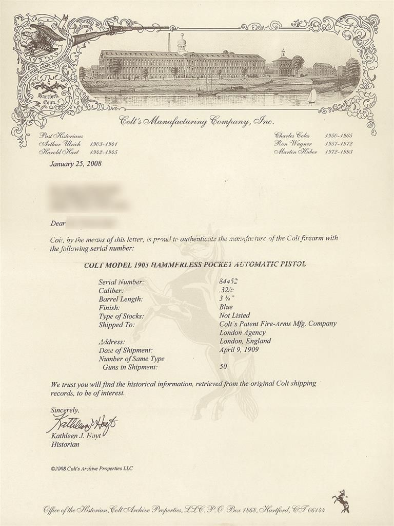 A) Manufactured in 1909. The accompanying factory letter verifies the configuration, except the grips, which are "Not Listed" and that it was shipped as 1 of 50 to Colt's London Agency, London, England on April 9, 1909.