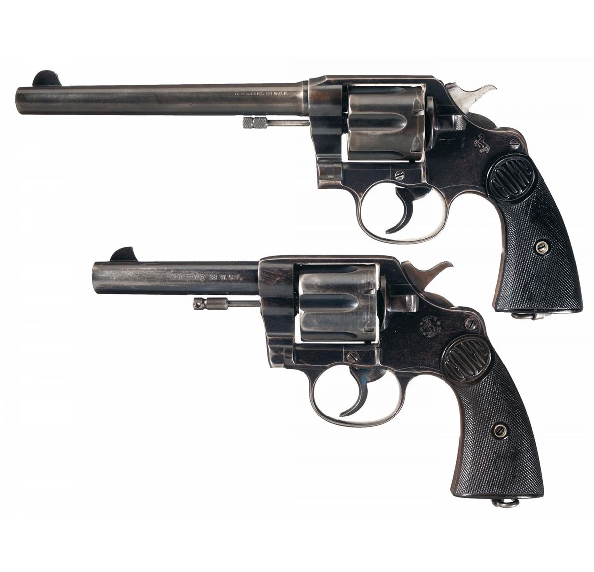 A) Manufactured in 1923 with two line address/patent dates on top of the barrel, the left side is marked "NEW SERVICE 38 WCF", with Rampant Colt on the left side of the frame. The serial number is marked on the frame and crane. Blade front and notch rear sights. Checkered hard rubber grips with "COLT" in an oval molded at the tops and lanyard ring on the butt.