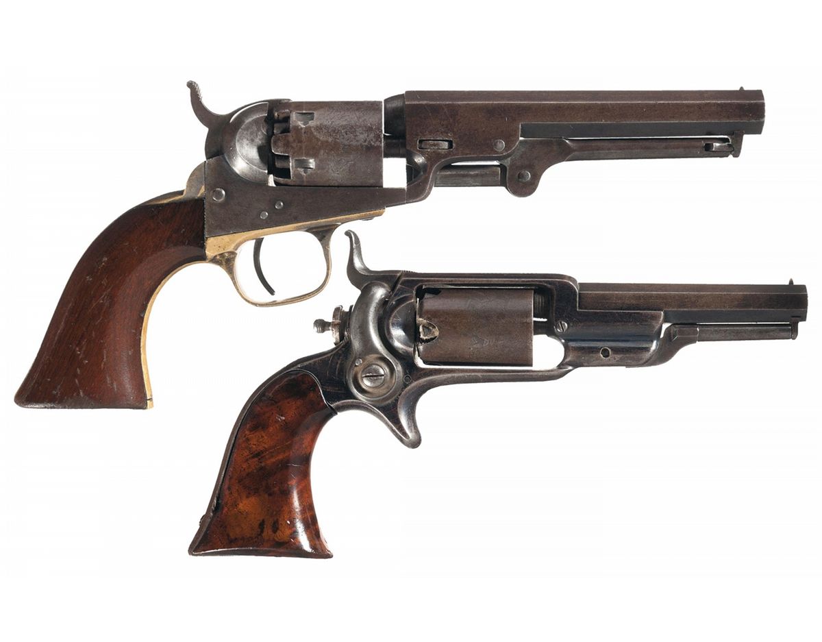 - B) Model 2 manufactured in 1855. standard markings with pointing hand barrel address, and Indian and cabin scene on the cylinder. Fitted with a smooth one-piece walnut grip.