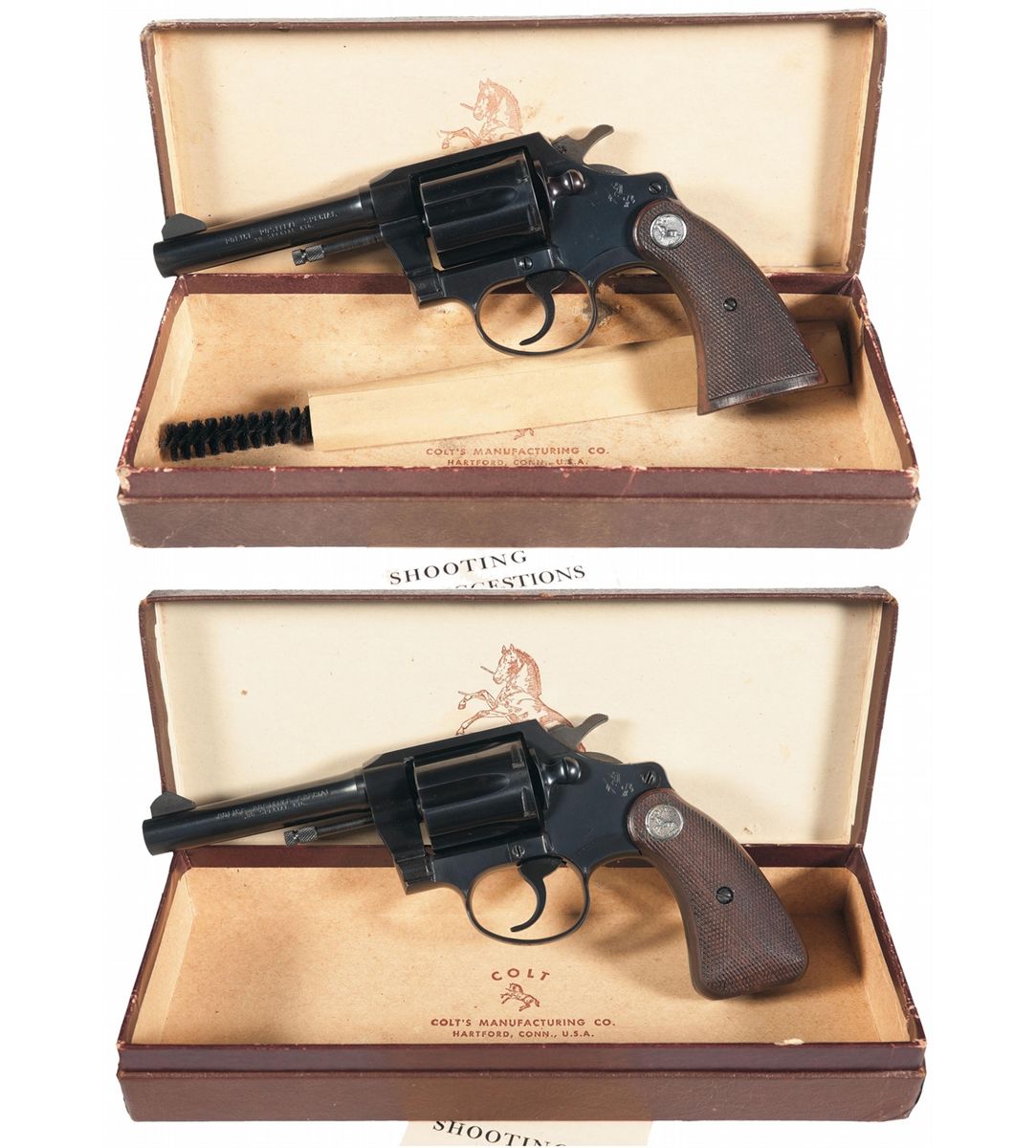 - B) Manufactured in 1962 with a serrated trigger, serrated hammer, blade front and rear frame notch sights and is fitted with checkered walnut grips with silver Colt medallions. The gun has the number "13" painted in white on the back strap and the number "135" engraved on the butt. With a Colt brown hinged lid box numbered to another gun, with matching labels.