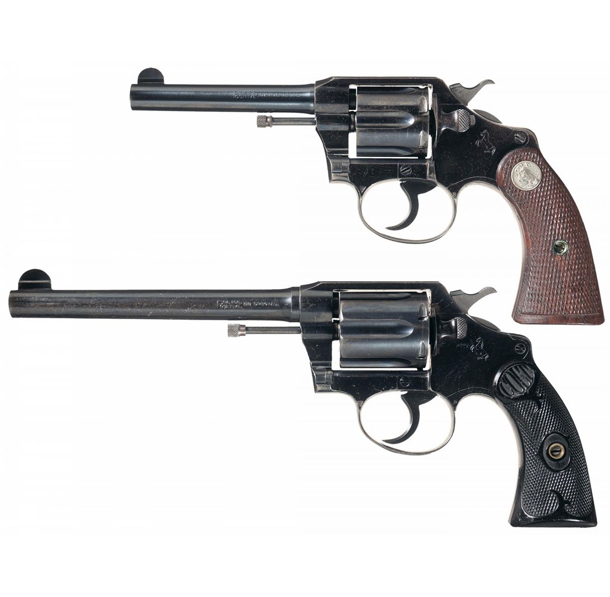 - B) Manufactured in 1920 with fixed blade front and frame notch rear sights, smooth trigger, checkered hammer, and fitted with checkered hard rubber grips with "COLT" imprints.