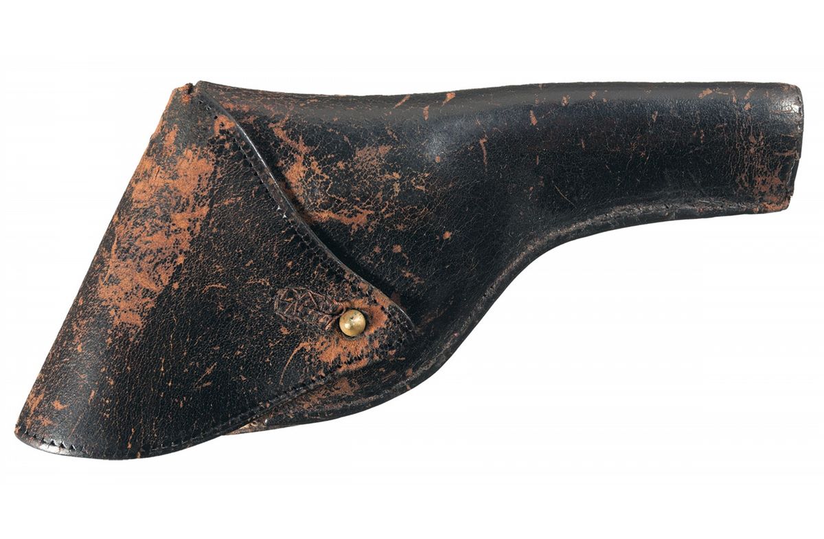 Condition: Very good, 80% original finish with the front and back straps a brown patina, some mild muzzle wear, some high edge wear and some areas of scattered spotting. The holster is fair with the belt loop ripped, some cracking, some flaking and some missing stitching.