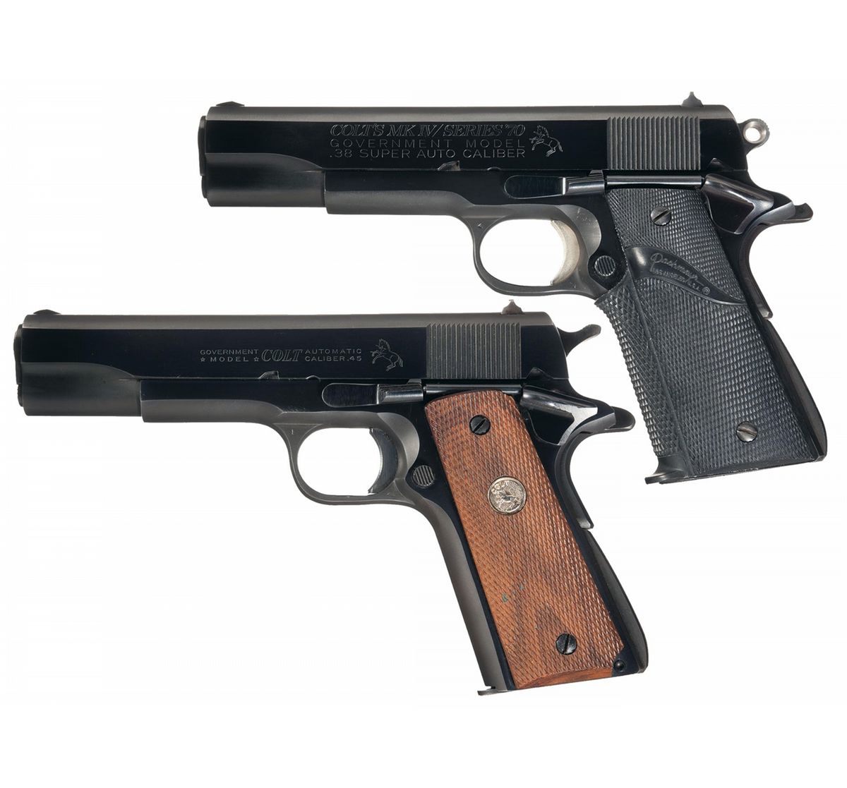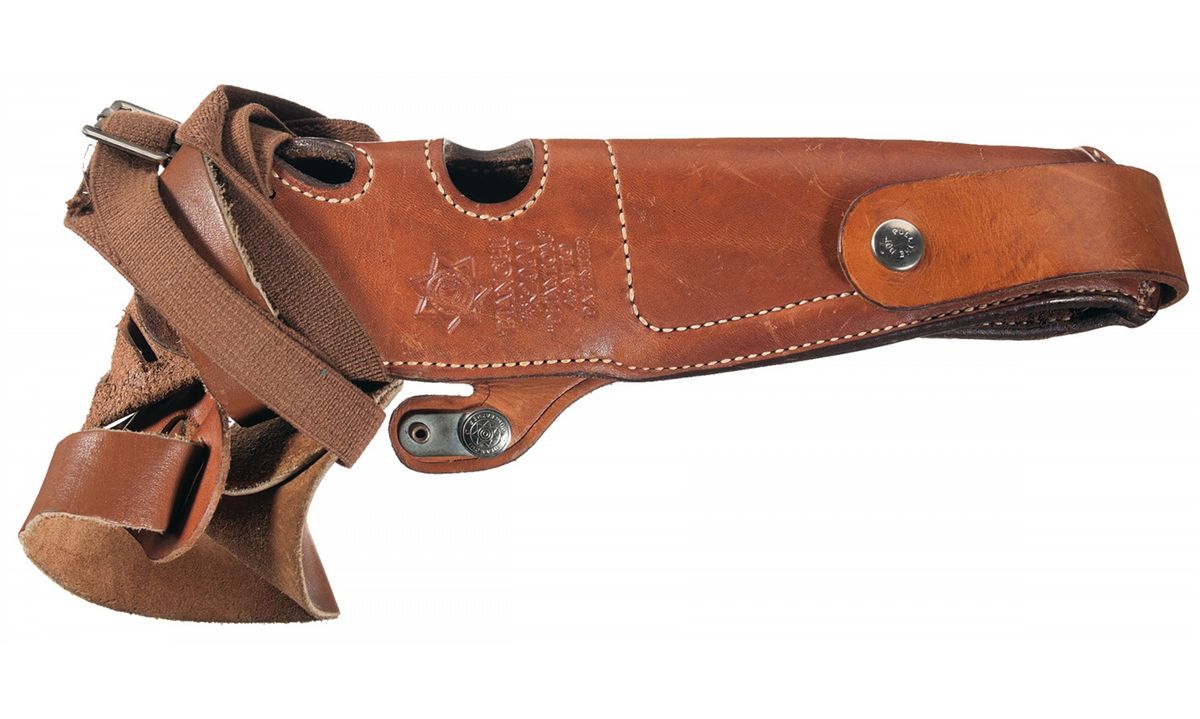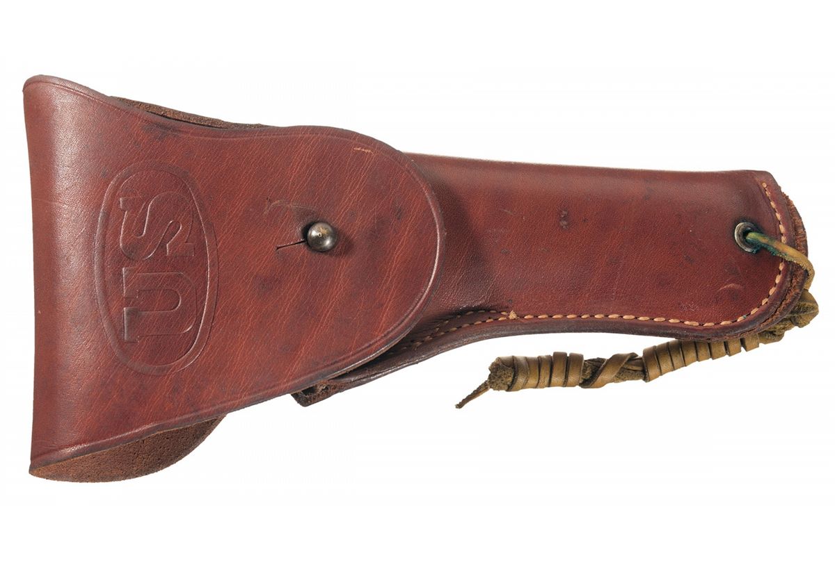 - B) Manufactured in 1966 with fixed low profile sights. The slide stop, magazine release, thumb safety, trigger, arched mainspring housing and hammer are serrated. Fitted with a set of checkered walnut grips with gold Colt medallions. With a leather flap holster embossed "US" on the flap and marked "BOYT/42" on the backside, a leather dual magazine pouch with "US" and "J.Q.M.D./1949/E.N.S." marked on the backside and two extra magazines.