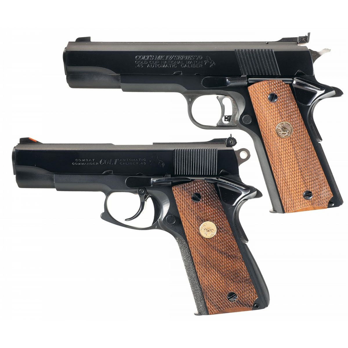 - B) Manufactured in 1987 with standard markings and features with stippled front strap. Fitted with checkered hardwood grips with gold Colt medallions.