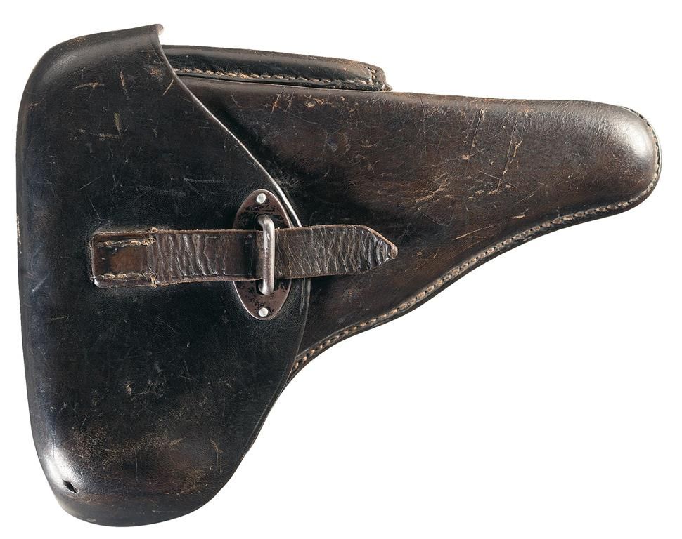 Very fine. The pistol retains 90% original blue finish showing some thinning to a gray. Initials are hand inscribed on the front grip strap. The grips are fine with a few minor handling marks. Trigger must be manually set to the ready position after action is cycled due to weak return spring. The holster is good.