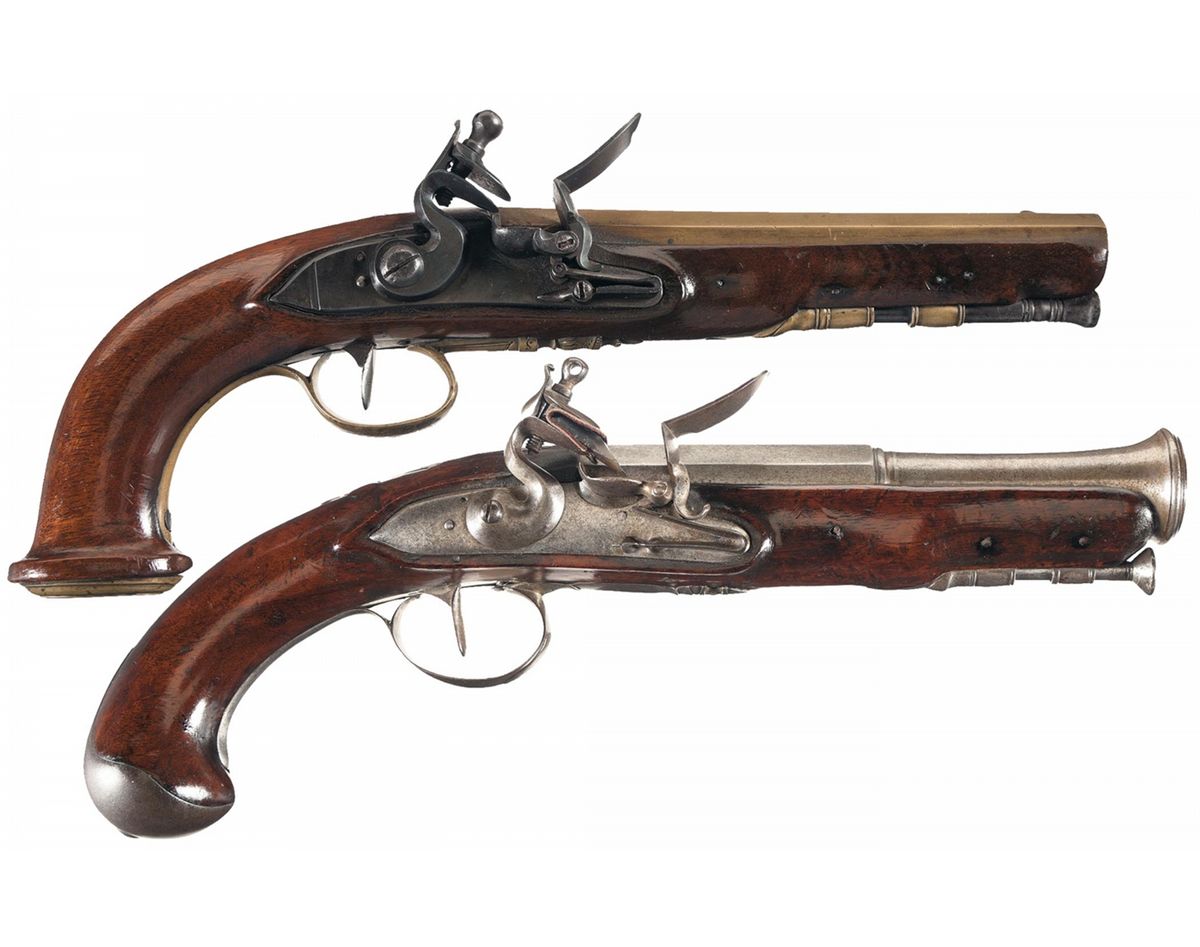 A) The Liege ELG proof on the left barrel flat is the only marking on the pistol. The barrel, trigger guard and ramrod pipes are brass. The stock has a flared butt with an engraved brass cap. The trigger guard is also engraved. It has an iron ramrod.