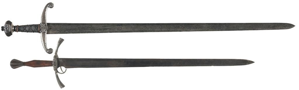 1) 19th century European longsword, 44 inches overall with a 36 inch double edged triple fuller blade. The blade has a hexagonal cross-section, with light scroll etching on the forte and a dished finger rest at the ricasso. 9 3/8 inch swept cross guard, with a beaded side ring, a protective extension for the finger rest, contoured "hand and a half" grip with scroll decorated leather cover and a flanged pear-shaped pommel. 2) 17th Century Broadsword (German probably Solingen), 39 1/4 inches overall with a 33 1/4 inch blade, hexagonal profile with an unidentified stamp within the triple fullers and a large stamped face ahead on the reverse. Floral accented dual quillion guard, 7 inches wide with a roped bottom, wire wrapped grip and a hexagonal faceted pommel (possibly 17th century) with geometric decoration.