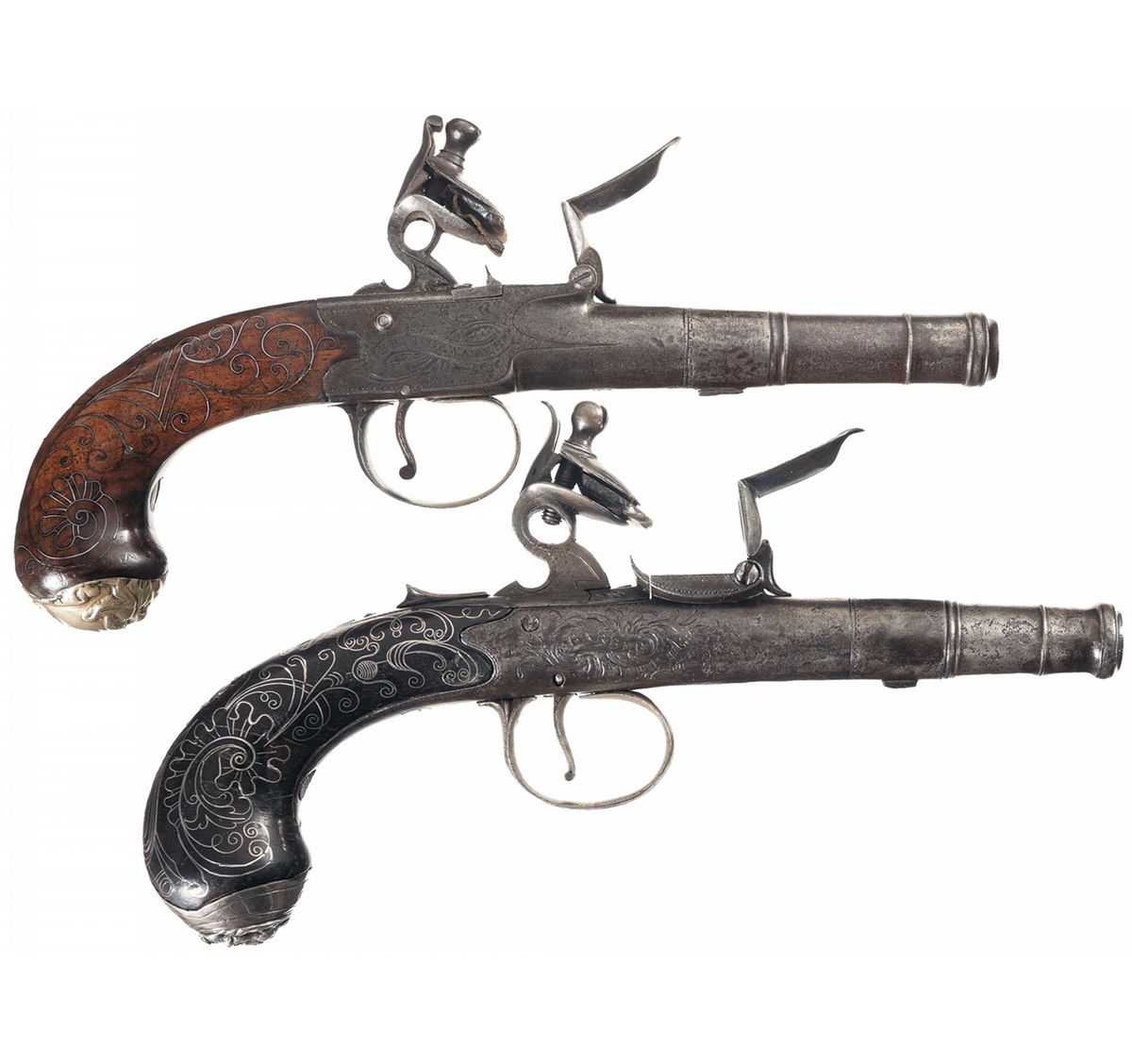 A) Floral engraved frame with "BRIDEWATER" in a banner on the right side and "PYKE" in a banner on the left side with two British proofs stamped ahead of the trigger. Grip has a brass cap with a raised face and a silver wire inlaid pattern.