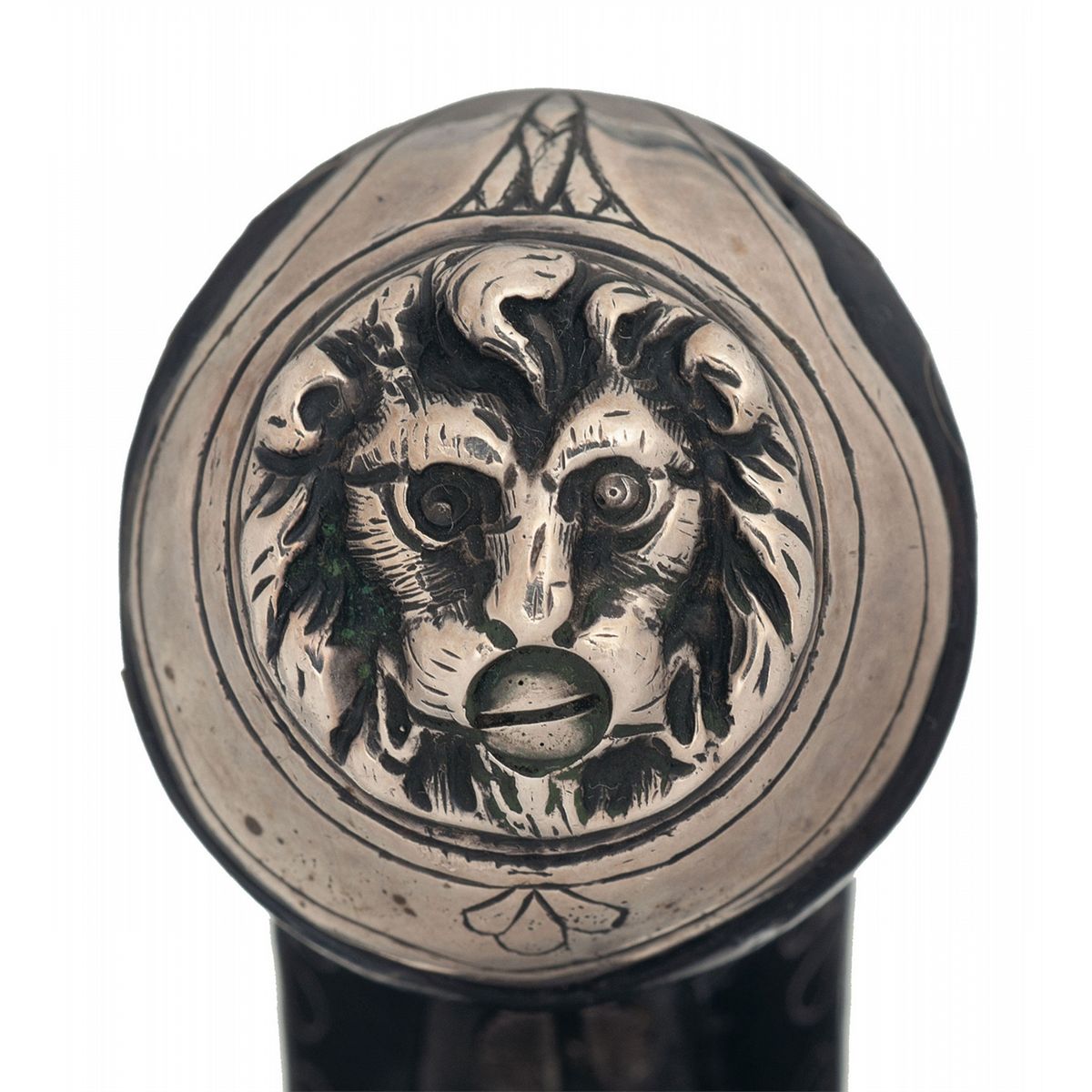 Condition: Good. The pistol has a mottled gray patina. The grip is very fine with some scattered minor handling marks and half of the silver remains.