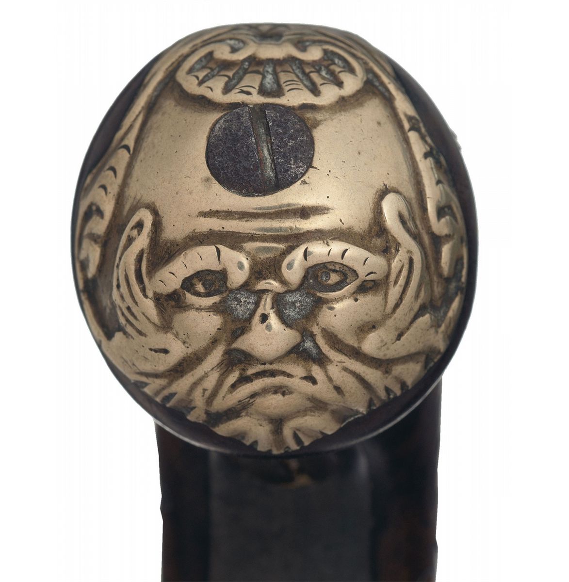 Condition: Fine. The pistol has a mottled gray patina with some minor pitting and an artificial brown on the trigger guard. The grip is fine with a couple hairline stress cracks and a repair. Most of the silver remains.