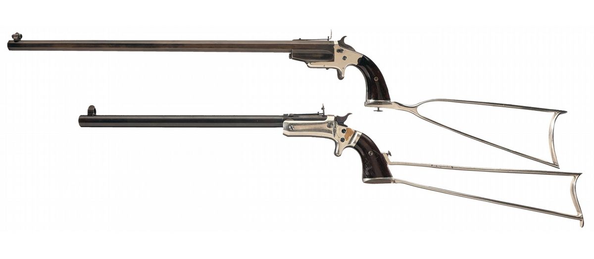 - B) Manufactured from 1875 to 1896 with side plate. Two line address/patent dates marked on barrel with hooded front and adjustable rear sights. Barrel, stock hardware, barrel release and grips are numbered to gun. The stock is numbered to another gun.