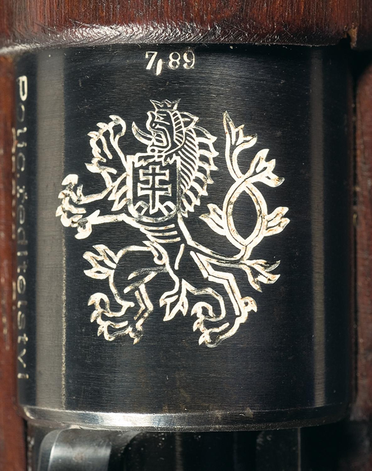 A) This is a rare Czech Police VZ25, serial number 89. The top of the receiver ring is marked with a small "7,89" over the large Czech crest and the left side is marked "Polic.Reditelstvi / Opava 89". The two line Brno address/model marking is stamped on the left receiver wall. Ramped inverted "V" front sight with side protectors and tangent rear sight. The left side of buttstock is stamped "POLIC. REDITELSTVI / OPAVA / 89". Complete with a leather sling and bayonet marked "CSZ". Matching numbers on receiver, bolt, floor plate, and stock.