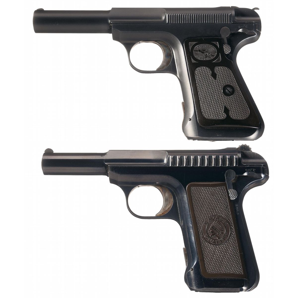 A) Manufactured from 1917 to 1928. Top of slide has the two line address/patent/caliber marking with the frame having "SAFE" and "FIRE" markings only. Fitted with checkered Savage logo grips.