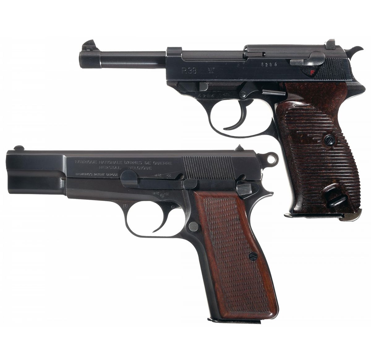 - B) This is a excellent example of a early post WWII commercial or military contract pistol as produced by the FN factory in Herstal Belgium. This pistol is basically the same as the prewar model with some slightly different markings and finish. The left slide still has the standard two-line and "BROWNING'S PATENT DEPOSE" markings with the standard FN acceptance proofs. The right side of the pistol has the stacked serial number on the frame and slide with the matching barrel serial number on the back side . It has the standard fixed front and rear sights and is fitted with a set of checkered walnut grips. It is complete with an original post war black leather holster with one original FN spare magazine.