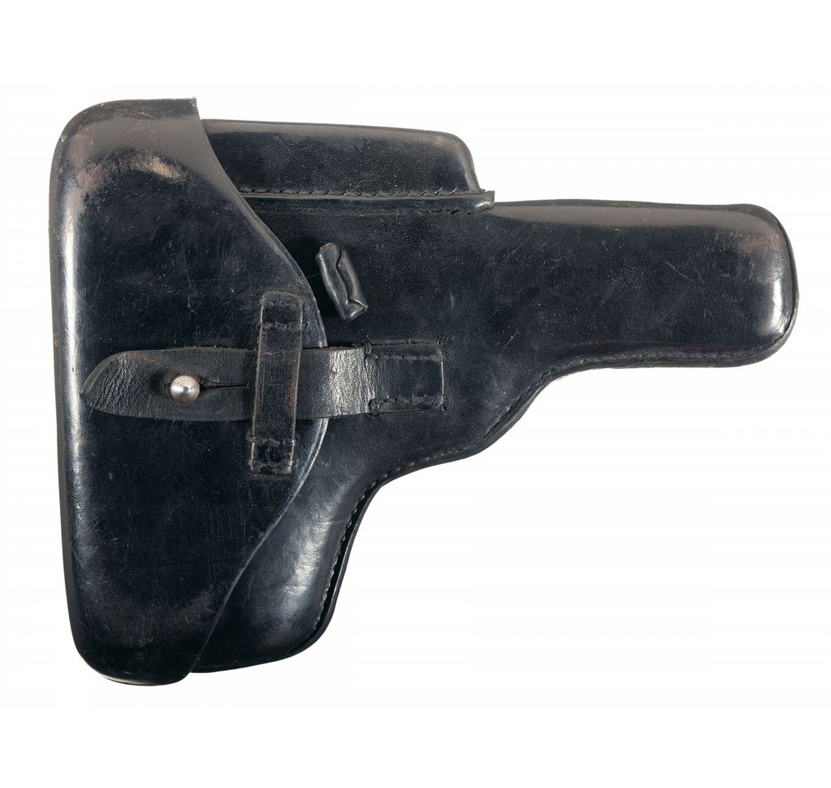 Condition: Very fine with a 97% of the original wartime blued finish with edge and high spot wear overall with a hint of thinning on the front grip strap. The plastic grips are also in excellent condition. The holster is also in very good condition with nice black color overall with tight stitching showing some scuffing, and age cracks on the front. As noted this pistol has all the correct matching numbered parts, except the magazine which are unnumbered. The feed ramp has been polished subsequent to manufacture, most likely by shooter. A nice late Mauser P38 pistol rig.