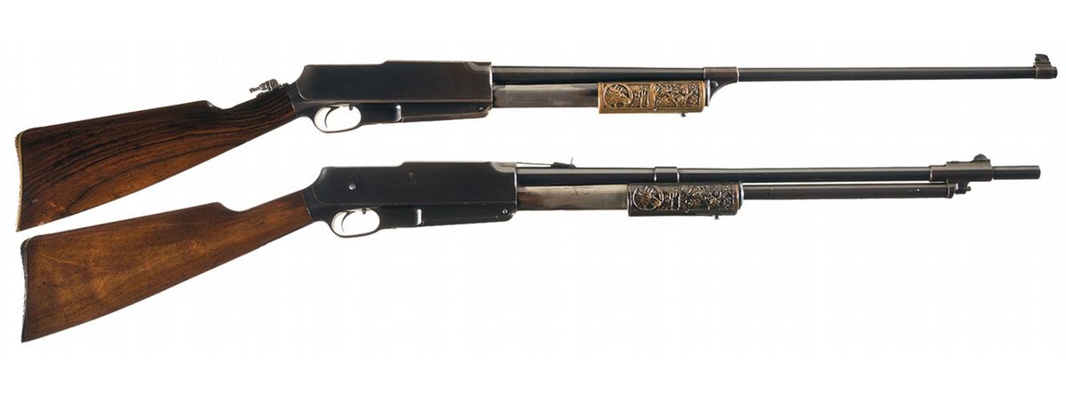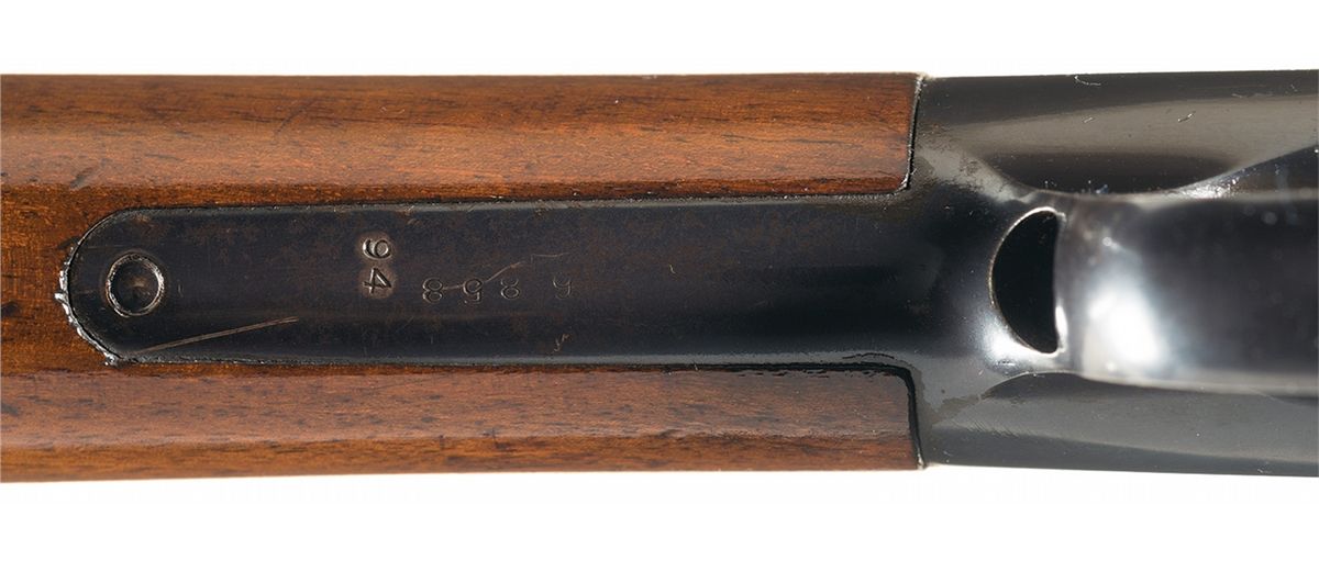 Manufactured from 1909-1911 with this example having an early production 25 inch barrel. Beaded blade front sight (likely a replacement), correct cut off plate for a standard rear sight and Lyman IA peep sight (a factory option and install). Two-Line Standard Arms Co. barrel address, Japanned bronze alloy forearm and buttplate featuring high relief wildlife and logo designs and straight grip walnut stock.