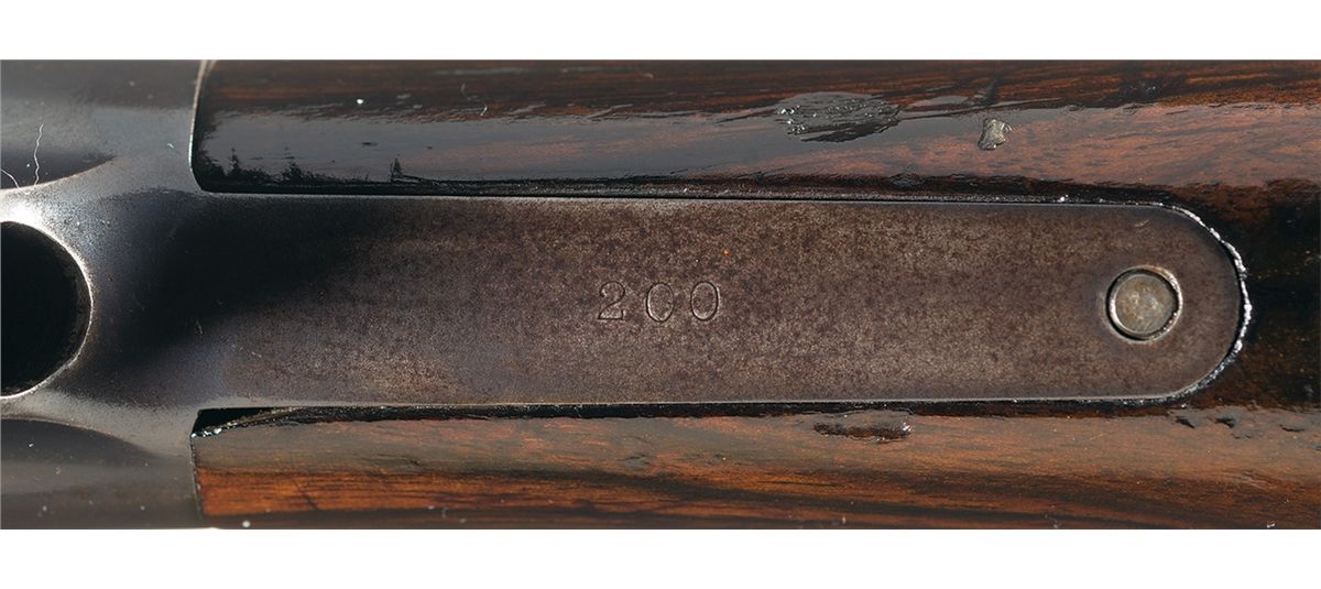 Fine. The rifle retains 60% faded original blue finish with a smooth gray patina on the balance. The forearm and buttplate have an attractive patina. The stock is very good with a small missing chip near the upper tang and a number of minor pressure dents and scratches. Mechanically fine.