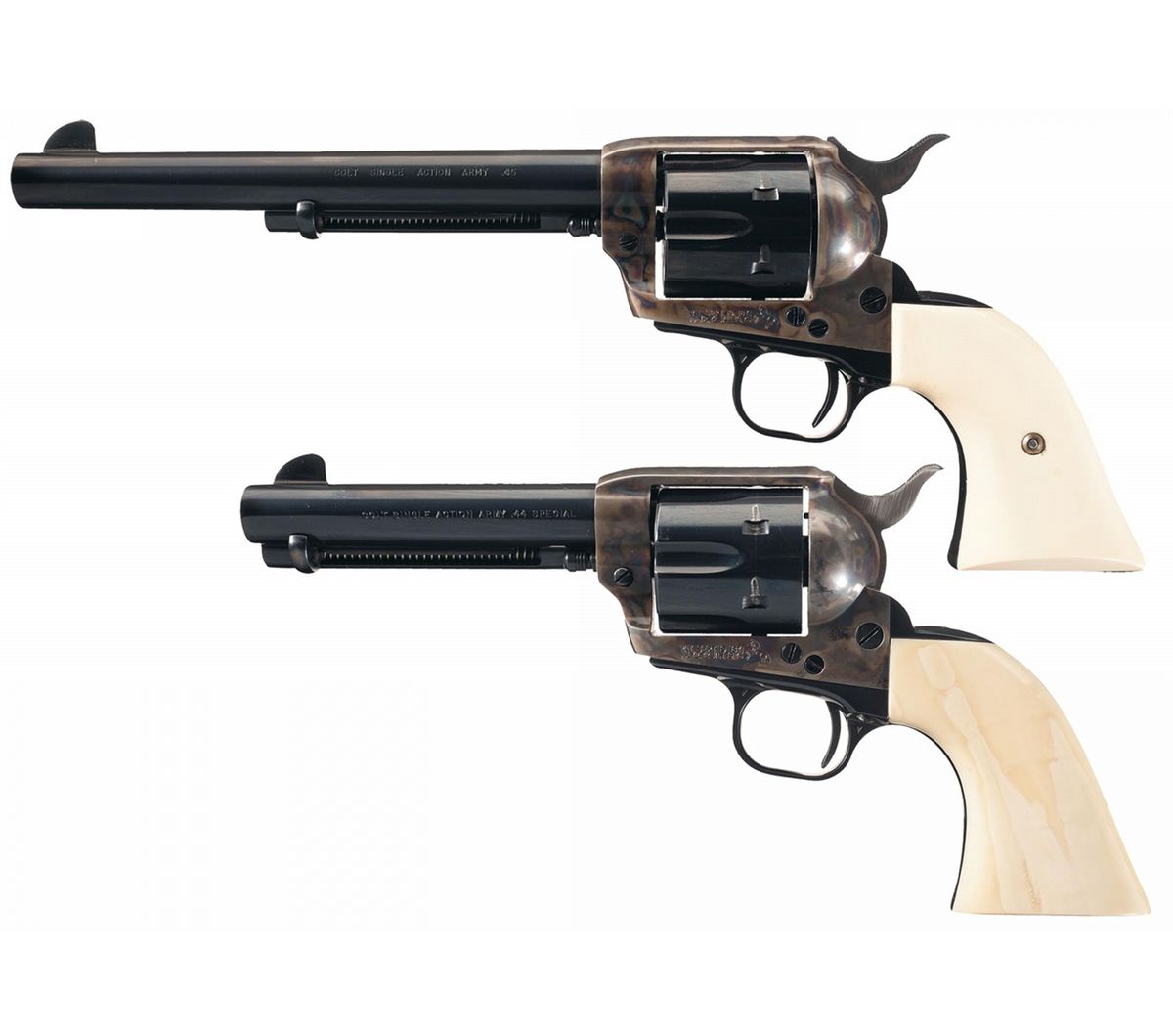 Condition: Excellent, 98% original blue finish with some high edge wear, a noticeable drag line and a small area of pitting on the cylinder. 98% of the case colors remain with some muting on the high spots. The ivory grip is excellent with some age cracks.