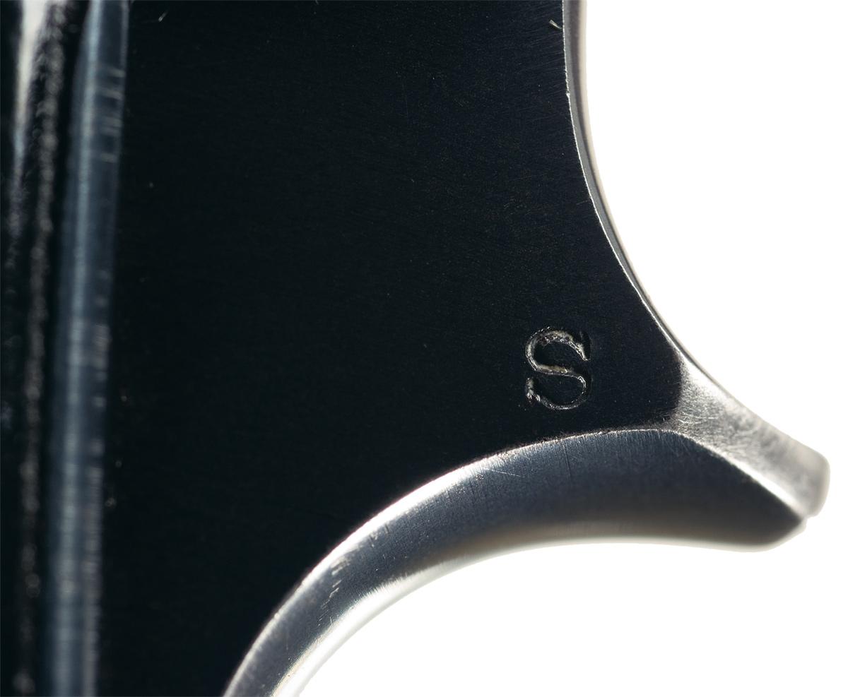 Condition: Excellent. The pistol retains 98% plus original high polished blue finish with some minor thinning on the grip straps and limited minor spotting on the underside of the frame. The grips are also excellent with a few minor handling marks. Mechanically excellent.
