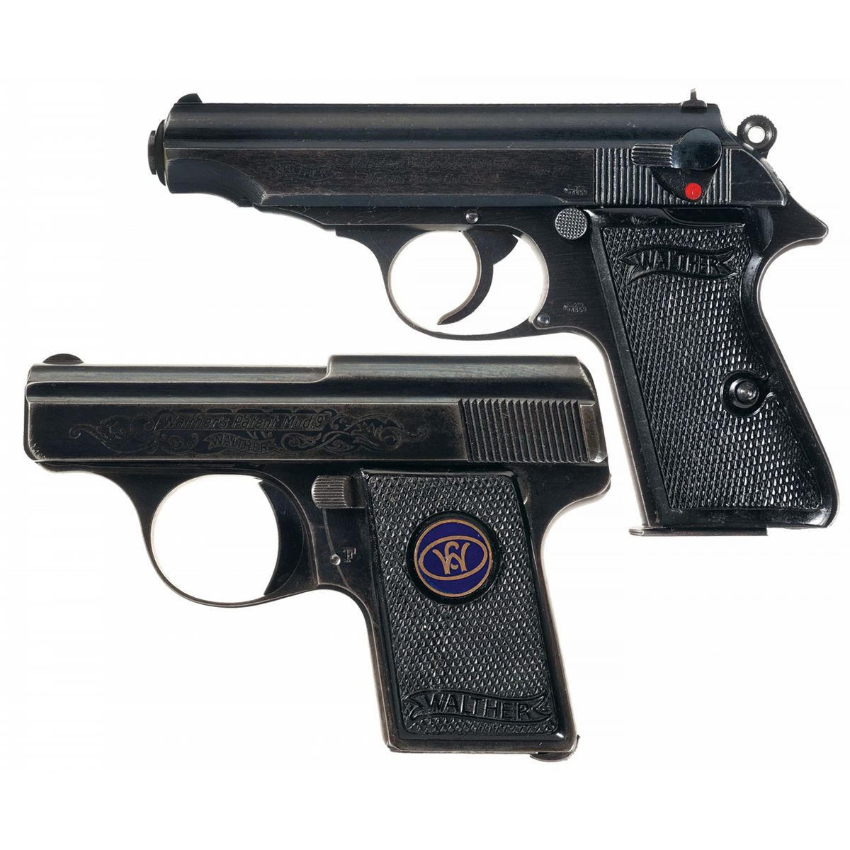 - B) Manufactured from 1921 to 1944 with this example having a factory scroll etched pattern around the slide markings. The left side of the slide is marked "Walther's Patent Mod. 9" above the Walther banner and the right has the Walther address marking. Fitted with checkered grips featuring the intertwined logo on left panel and "6.35" on the right panel.