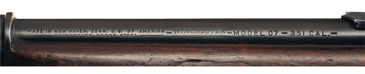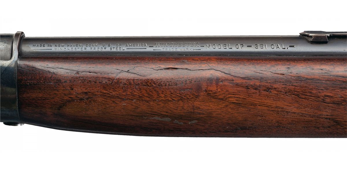 Condition: Very good, the barrel retains 75% of the thinning original blue finish with some wear. The forearm cap, receiver and magazine have a smooth gray patina with traces of original finish. The forearm has a long crack on the right side and is otherwise very good. The buttstock is very good as refinished with some scattered scratches and minor dings and a slight crack.
