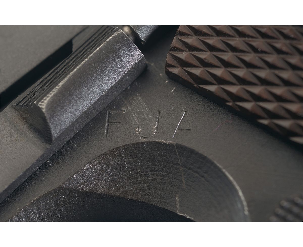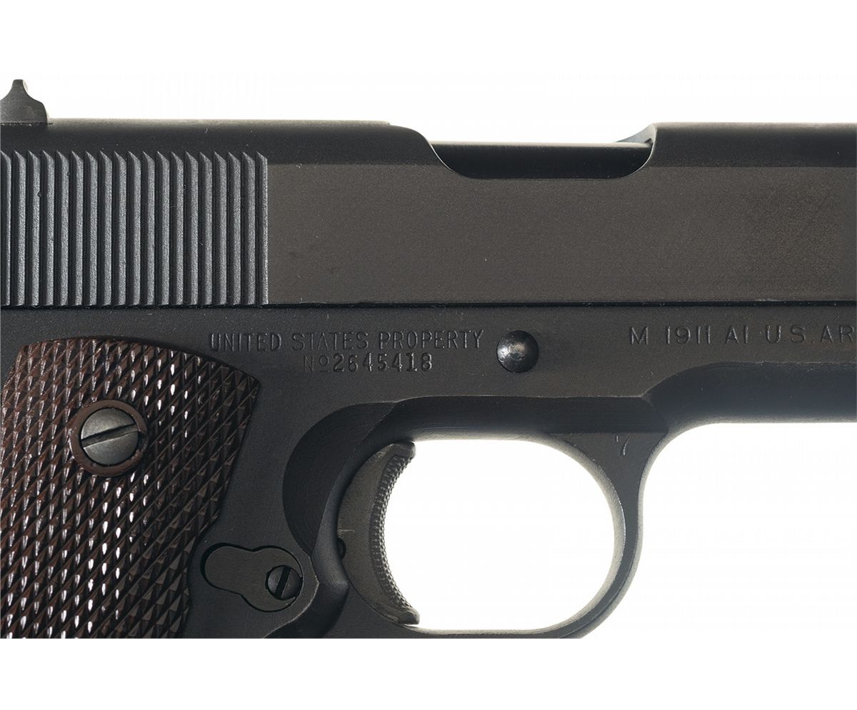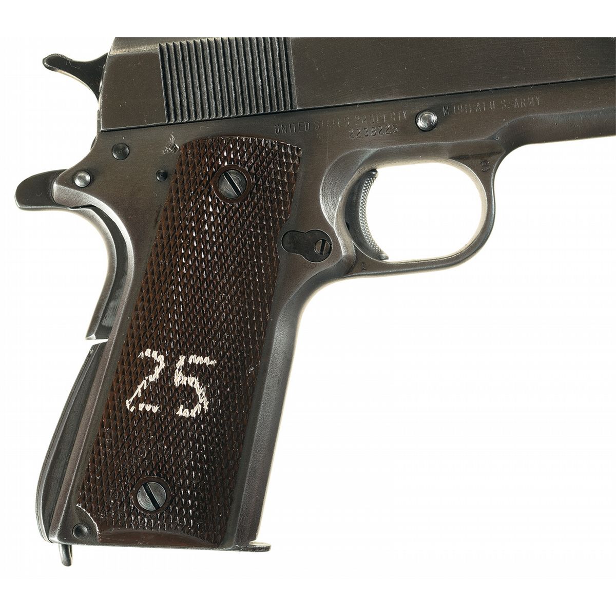 Made in 1945. Fixed sights, with the third pattern slide markings of: "REMINGTON RAND INC./SYRACUSE, N.Y. U.S.A." and "P" on the slide, Atwood inspected frame with "NO." style serial number marking, stamped trigger, thin hammer, serrated mainspring housing and slide catch, Keyes Fiber grips with "25" in white paint on the right panel, "R" marked full-blue magazine and a Flannery barrel.