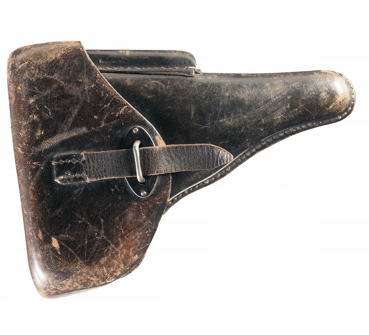 Very good. The pistol retains 70% original blue finish with a smooth gray patina on the balance. The grips are very fine with a series of scratches on the right panel and a few nicks on the grooves. The left panel has a raised bump, likely a factory error. Holster is very good with flex wear and handling marks with overall tight stitching.