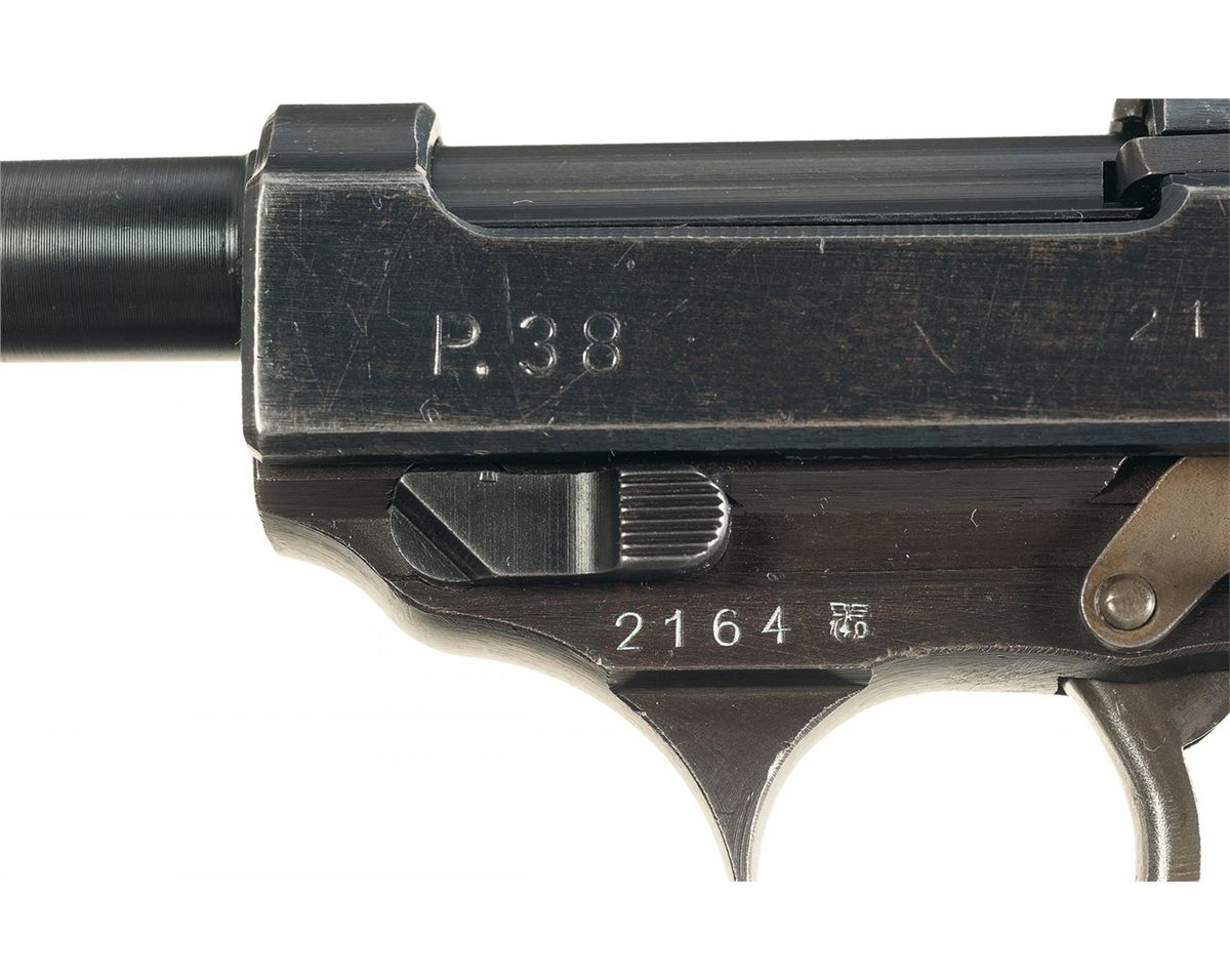 A) "Eagle/WaA135" proofs with the left side of the slide having the "byf/44" marking. Visible "y" block serial numbers match. Fitted with ribbed grips. The "jvd/P.38" marked magazine has "jvd" on the spine.