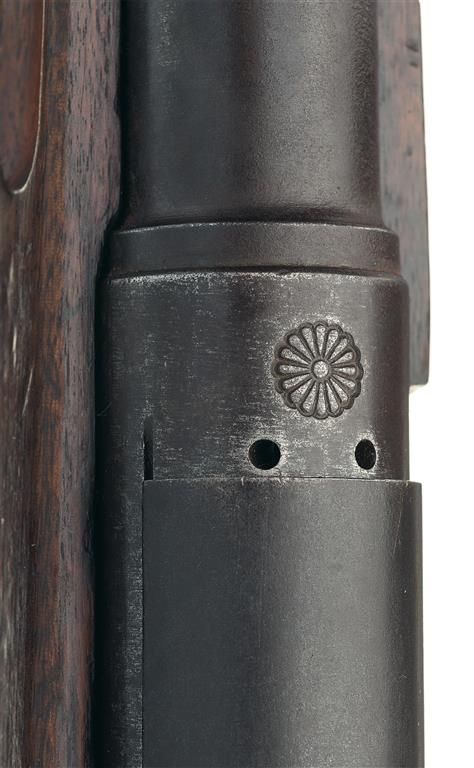B) This is an early series 5 type 38 carbine manufactured at the Nagoya Arsenal. The top of the receiver has the royal chrysanthemum intact over the kana markings. The series mark, serial number and Nagoya factory mark are on the left side of the receiver. It is fitted with the short staff rear sight graduated from 4-20 (400-2,000 meters) with the inverted "V" front sight. It has the original two-piece stock with the cupped buttplate and single barrel band. It comes with an original, sheet metal dust cover, late war plastic push-on muzzle cover, original cleaning rod and original leather sling. The trigger guard and floor plate are both marked with "C44Y" which may have been an identification/proper mark of the veteran who brought the rifle home.