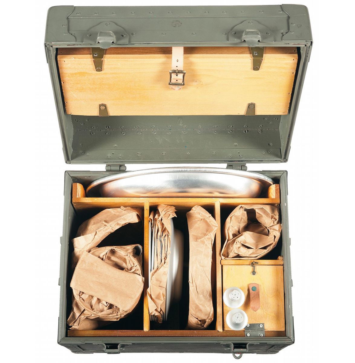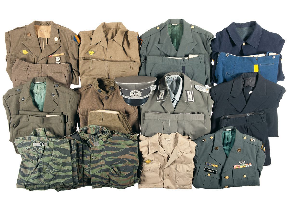 1) tiger stripe jacket with liner. 2) tiger stripe blouse. 3) tiger stripe pants. 4) tiger stripe bandana. 5) Navy service dress blue suit coat. 6) Navy service dress blue trousers. 7) Army air defense artillery specialist 4 jacket with jump wings and Vietnam service ribbons. 8) Indian wars Cavalry Company Quartermaster Sergeant blouse with service medal and trousers. 9) East German NVA infantry Senior Officer uniform with DDR medal, officers brocade belt, hat and gray shirt. 10) U.S. Army officers blouse and trousers. 11) WWI Sergeant Signal Corps service coat and trousers. 12) WWII Army Technician 4th grade shirt. 13) U.S. Marines Corporal blouse with trousers, 2 garrison caps and a belt buckle. 14) U.S. Army Technician 4th grade blouse with marksman medal, infantry collar disks and trousers. 15) U.S. Army Technician 4th grade tan shirt with tie and garrison cap. 16) Tableware outfit crate with paper wrapped utensils and plates.