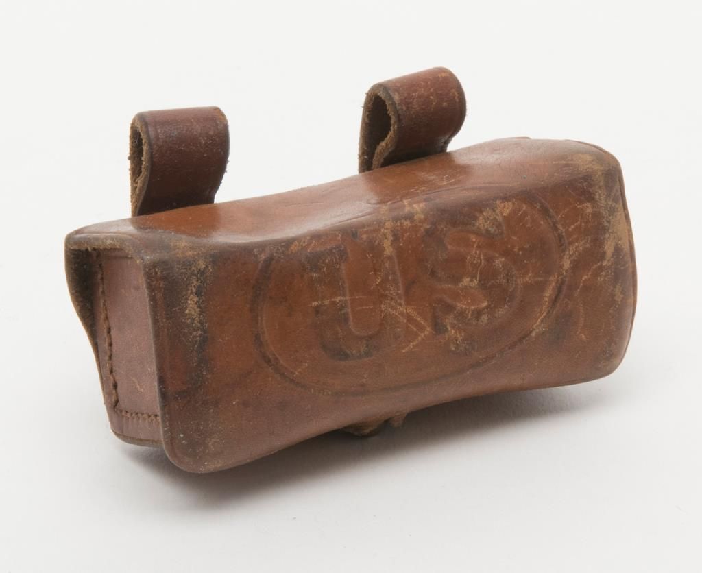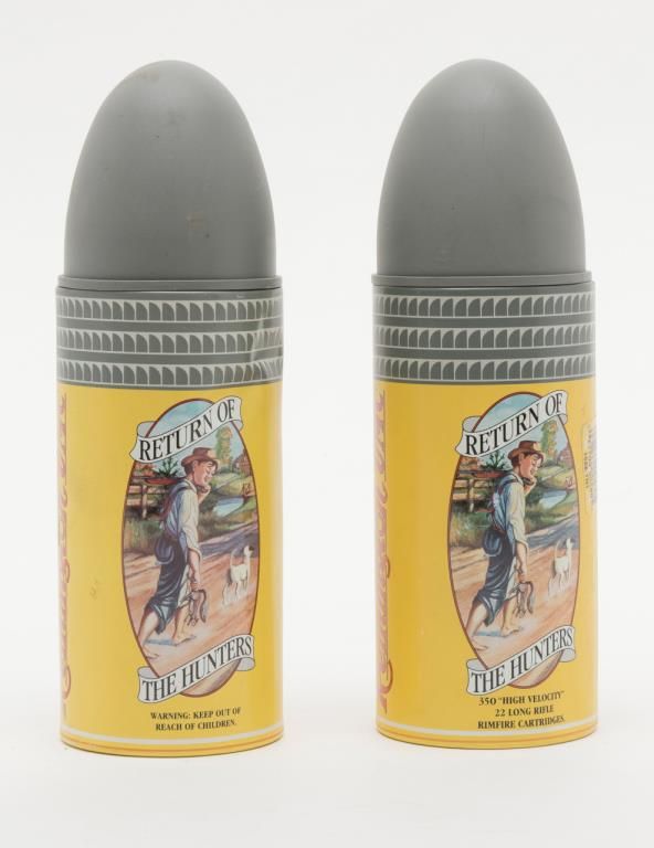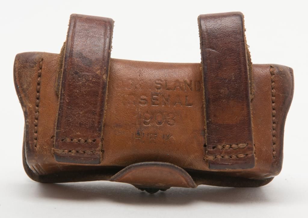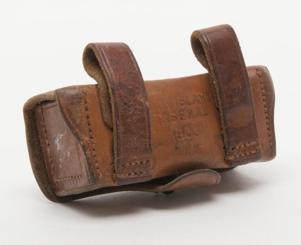 Collector’s lot including 2 1995 “Return of the Hunters” Commemorative cans of 350 rounds each of .22LR “high velocity” RF Remington-UMC cartridges, an un-marked concealment waist band for wearing two pistols, one of each side and a brown leatherRock Island Arsenal U.S. cartridge belt pouch dated 1903 with H.E.K. inspector’s initials in overall good condition, missing interior wood block. Est.: $75-$100.