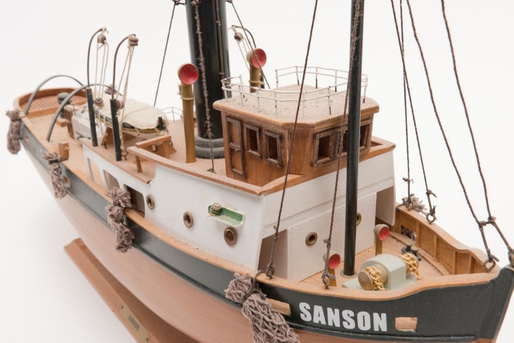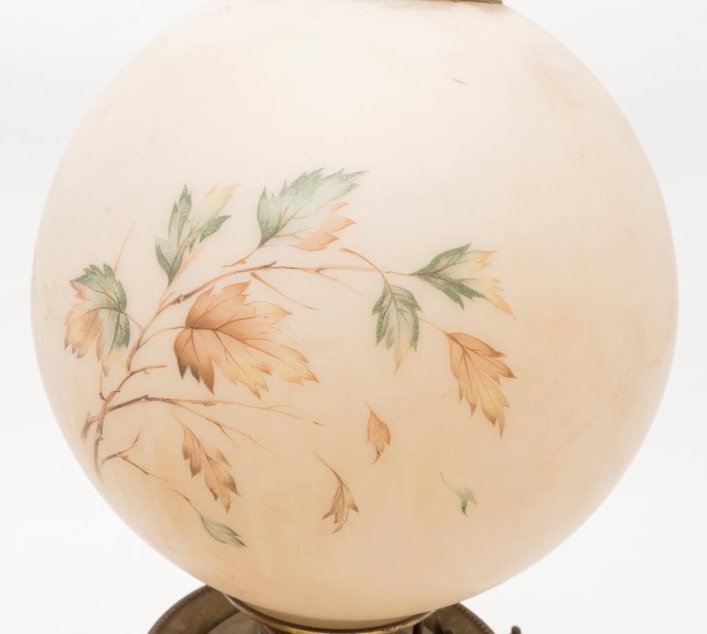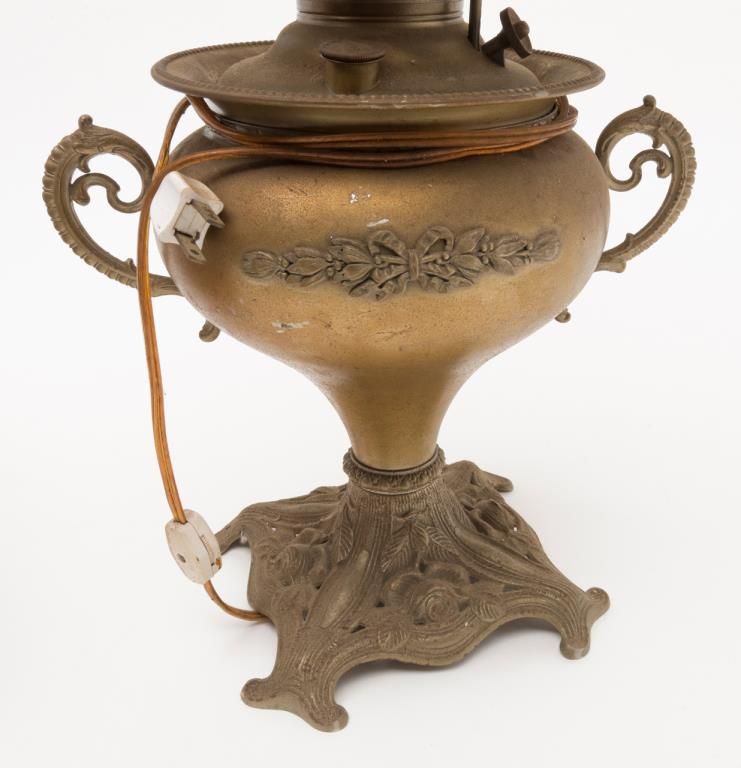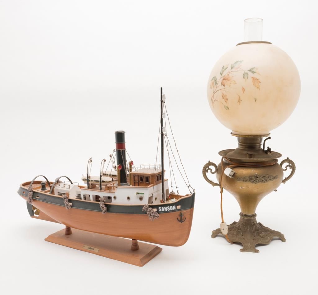 Collector’s lot including a “Gone with the Wind” ornate brass kerosene lamp with glass chimney and beautiful painted globe, overall height approx. 24” with the lamp having been electrified; also a hand-made large wooden model of a San Pedro tugboat on stand, “SANSON”, approx. 24” long, 6” wide and 10” high to the top of the wheel house. Est.: $100-$200.