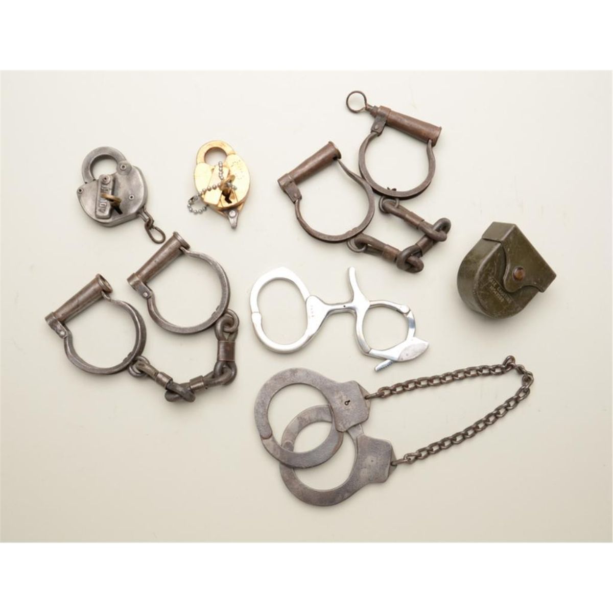 Collector’s lot of handcuffs and locks including 3 railroad locks with keys, two brass and the other an iron Adlake; one empty lock plastic case; two old slave type large handcuffs or leg irons, one with key; aHarvard Lock Co. pair of leg irons (no key); a rare pair of Pratt’s Combination handcuffs/come alongs, no key and lock mechanism needs work; a small bag of several China-made miniature thumb cuffs, misc. keysand an unusual miniature spike piece. Est.: $300-$500.