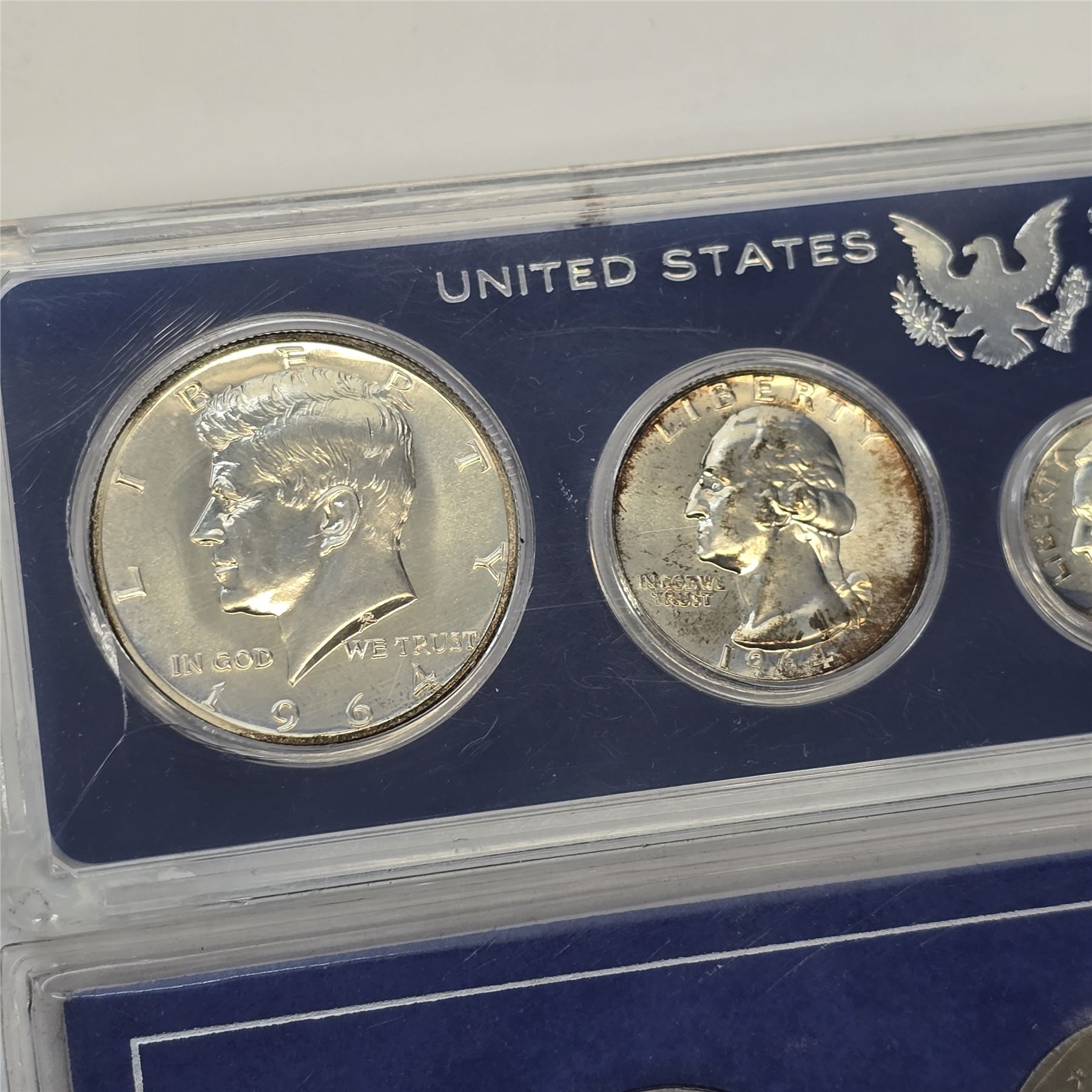 US Mint set of 1964 coins including Silver Half Dollar, Quarter and Dime. There is a crack in the acrylic.& nbsp; Also includes a SBA Dollar set in like new condition