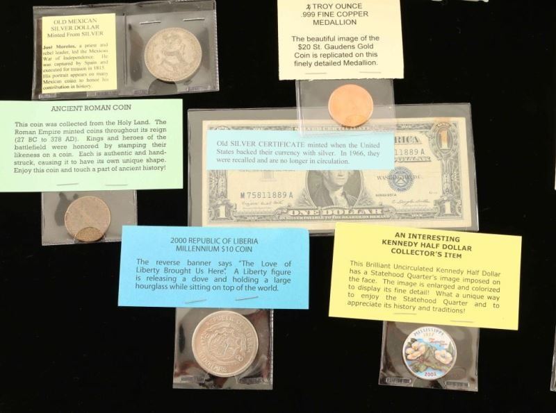 Including; Troy Ounce .999 Fine Copper Medallion, (8) Foreign Coins, Silver Certificate, 2000 Republic of Liberia Millennium $10 Coin, Kennedy Half Dollar Collector's Item, Gold stamp of Smithsonian Institution's 150th Anniversary, Ancient Roman Coin, Old Mexican Silver Dollar, (9) USA Basketball Collector's Cards by Fleer, and (25) assorted coin tubes and holders.