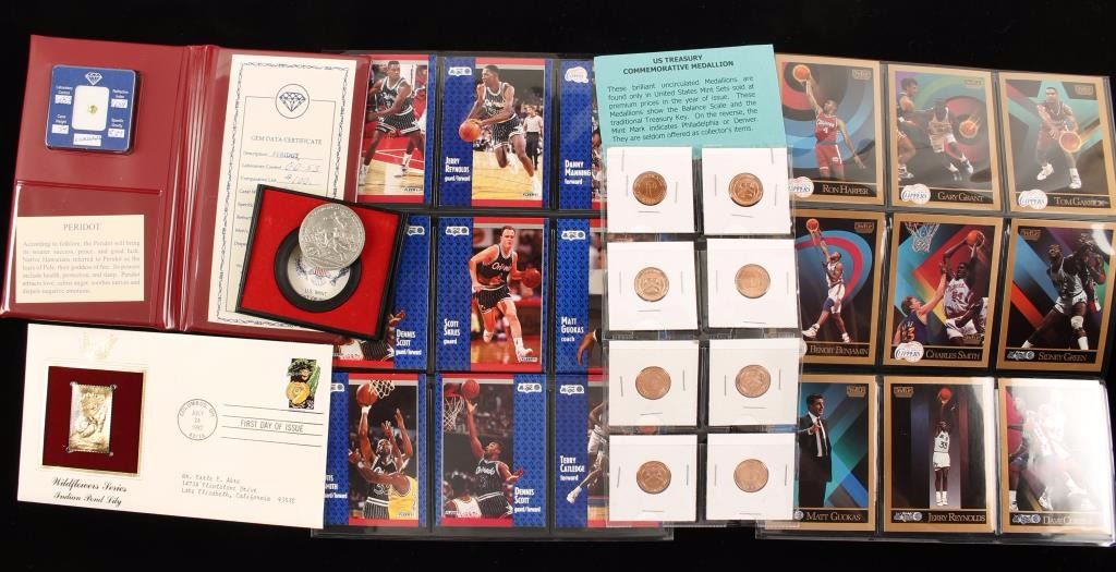 Bicentennial Medallion, US Treasury Commemorative Medallion, 24K First Day Commemorative Stamp-Wildflower Series, Peridot Gemstone with Gem Data Certificate, and18 basketball Collectors Cards.