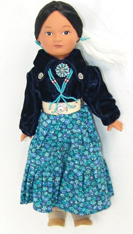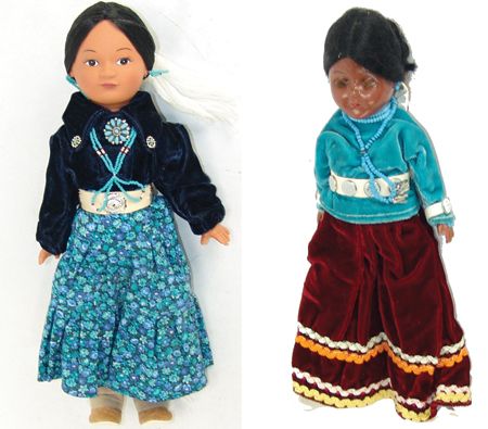 Late 1900s, Handcrafted Navajo-themed commercial doll in traditional dress, plus a plastic-faced version. Both in very good condition. 14", 11-1/2"