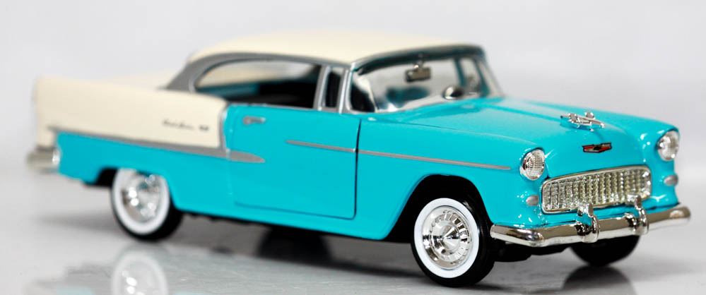 Collectors Edition 1955 Chevy Bel Air Hard Top (1/24 sc **|**|** 1955 Chevy Bel Air Hard Top. 1:24 scale diecast collectible model car. This 1955 Chevrolet Belair is an 8" long diecast classic oldies with openable doors, hood & trunk and workable steering.