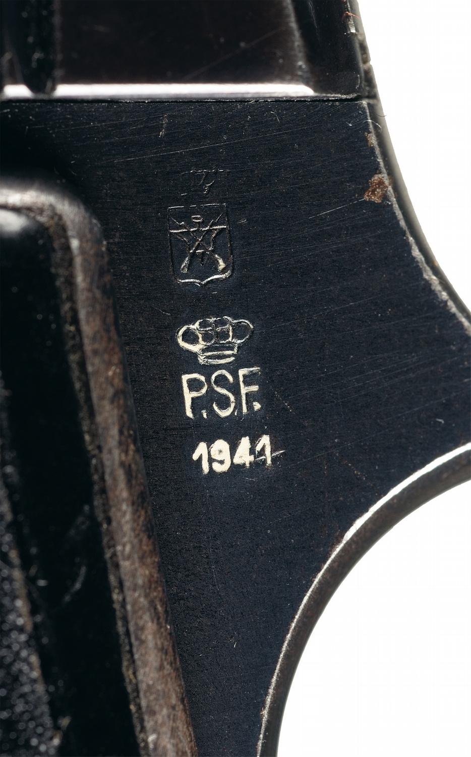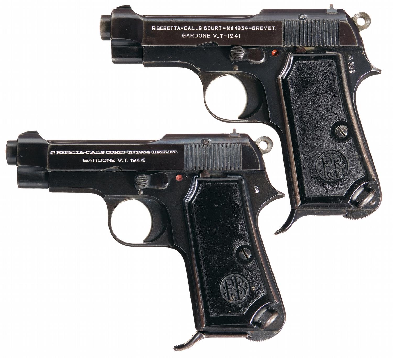 A) This Romanian contract pistol is identical to the Model 1934 with the following slide legend: "P. BERETTA-CAL. 9 SCURT-Mo 1934-BREVET. / GARDONE V.T.-1941". The left grip tang is stamped with 1941 dated Italian commercial proofs. Matching serial number on slide and frame. Fitted with standard "PB" emblem grips.