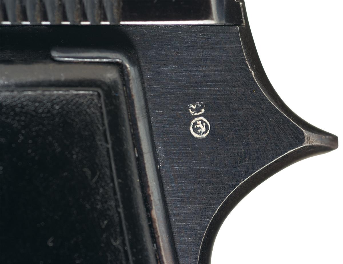 Condition: Excellent. The pistol retains over 95% original high polished blue finish with a faint plum patina and some minor edge wear (mostly on the slide). There is limited pin point pitting on the slide. Mechanically excellent. The magazine base pin is absent.