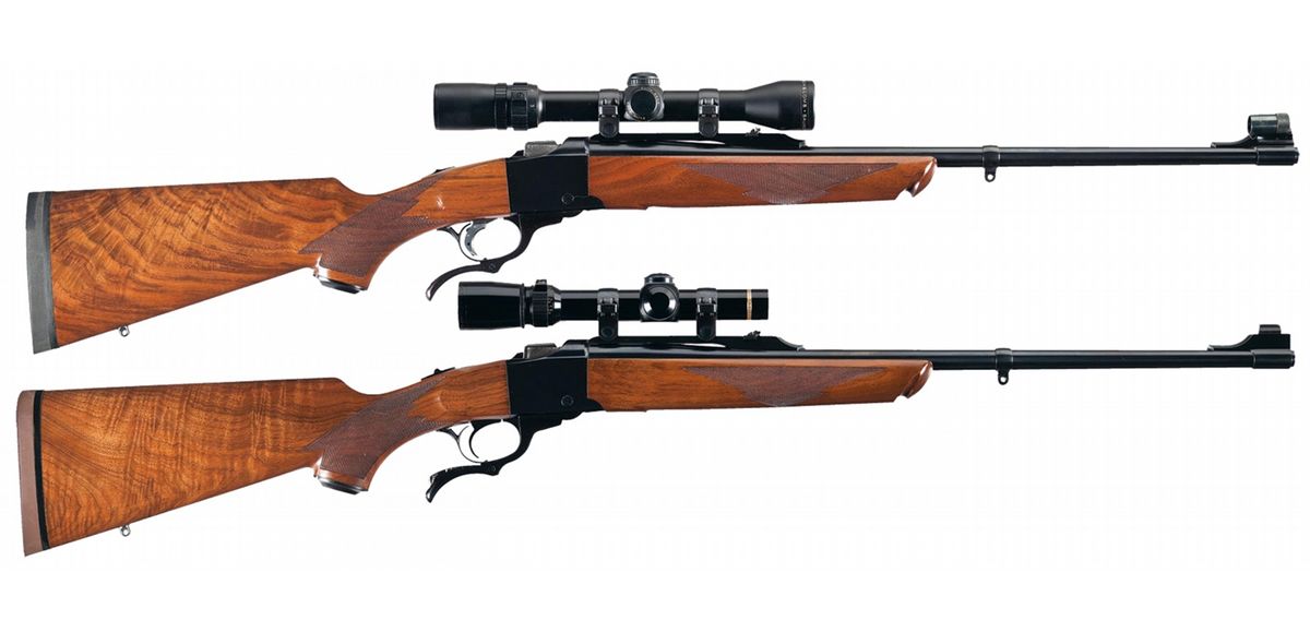 - B) Standard markings, ramp front and folding adjustable rear sights, serrated trigger and tang mounted safety. Equipped with a Leupold 1.5x5X scope. Checkered Alexander Henry style forearm and pistol grip stock with a solid rubber Pachmayr recoil pad, metal Ruger grip cap and swivel studs.