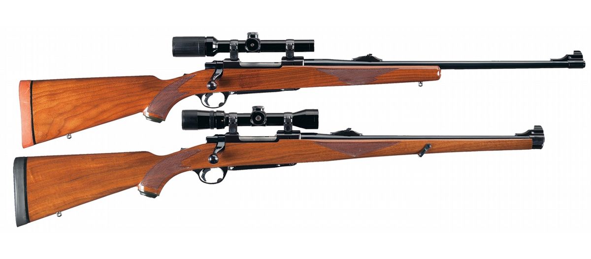 A) Introduced 1968-1992 with ramp front sight and elevated adjustable folding rear sight with standard markings. The receiver is milled for Ruger scope rings and has a Bausch & Lomb 1.5x6X scope mounted. Serrated adjustable Canjar set trigger, hinged floorplate and checkered pistol grip stock with tang mounted safety, plastic grip cap with Ruger emblem and solid Ruger red rubber buttplate.