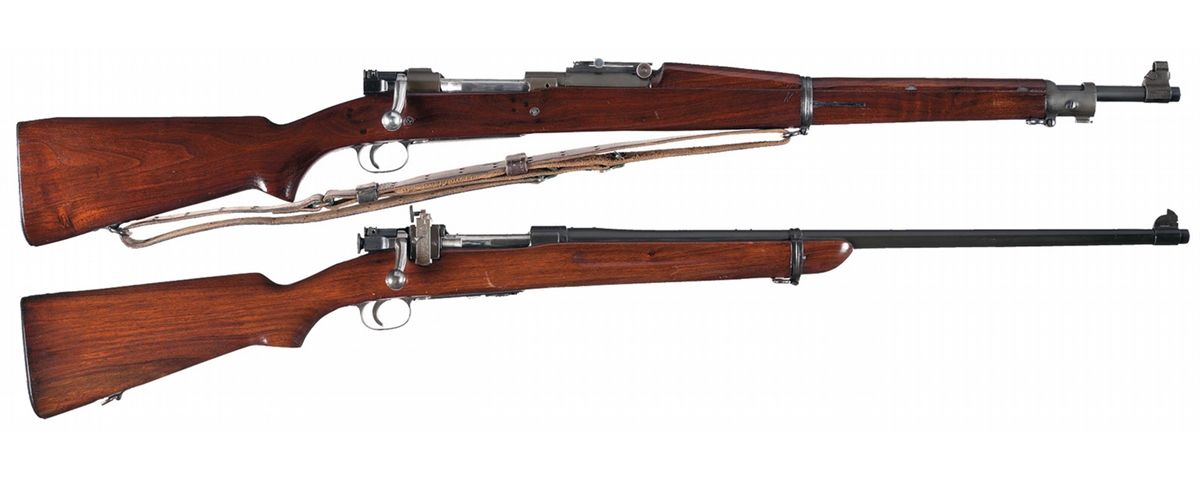 - B) Manufactured between 1924 and 1933. This version has been converted to the M2 configuration with a fixed front sight on a barrel marked "S A/flaming bomb/7-27" with two sets of drilled and tapped holes with filler screws, one just behind the barrel band and the other over the chamber area. There is a Lyman fully adjustable rear sight mounted on the right side of the receiver. The bottom of the bolt is electropenciled to match the gun. Mounted on a smooth walnut pistol grip stock with finger grooves, sling swivels and a checkered steel buttplate. The stock is marked on the grip cap area "M2" and just behind the grip cap area "D28225".