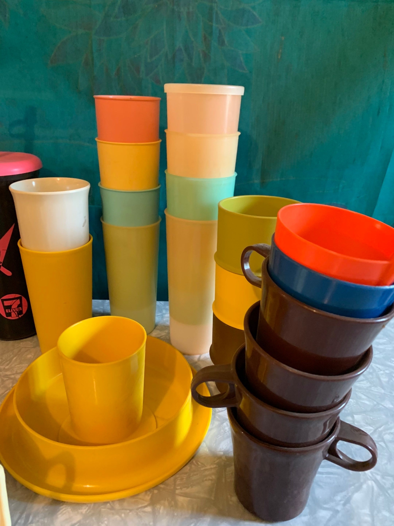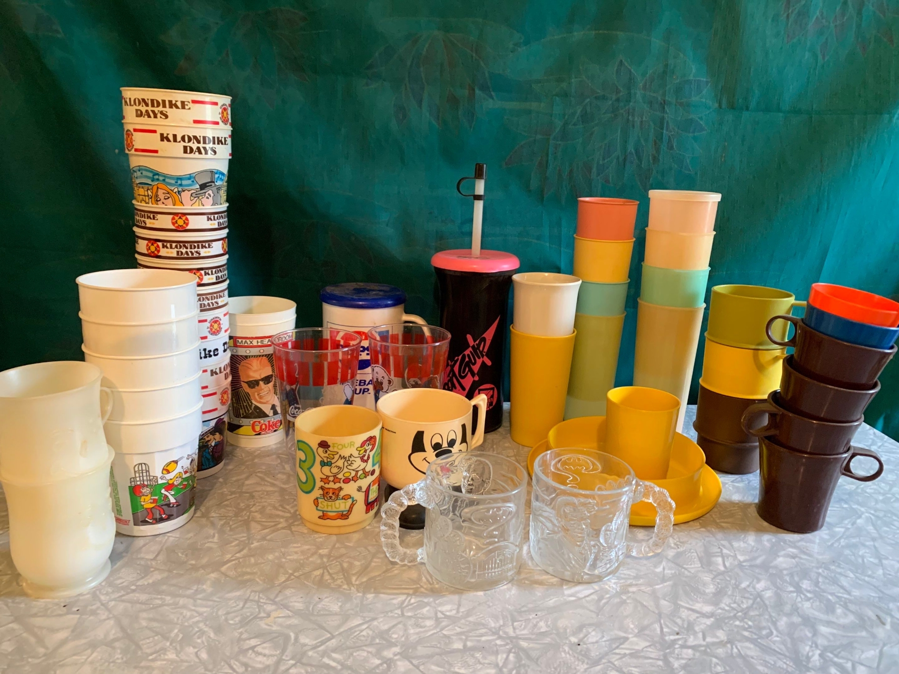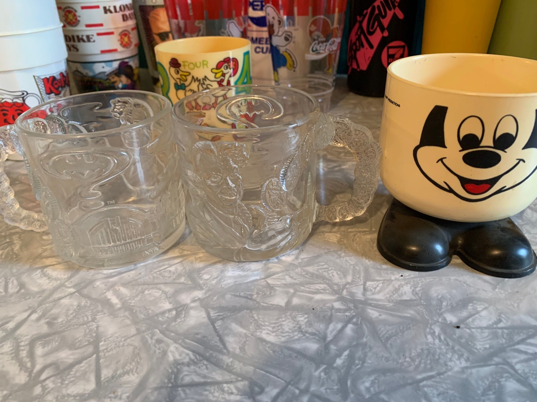 Collectors Vintage Cup Collection features vintage Tupperware, Kool Aid Cups, Klondike Days Cups, Vintage Mickey Mouse, Vintage McDonalds Batman Cups